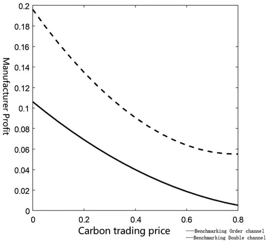 In the two-channel decision model of the benchmark method, the best profit of the manufacturer is affected by the carbon price, and at that time, the best profit of the manufacturer increases with the increase in the carbon price.