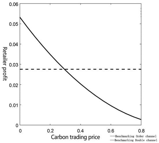 Figure 8 and Figure 9 show that, when the government implements the carbon quota allocation policy of the benchmarking allocation, the profits of both single-channel and dual-channel manufacturers decrease as the carbon price increases. This is because manufacturers need to invest heavily in emissions reduction under the benchmark policy to meet the requirements for carbon emissions, and when the price of carbon trading increases, the cost to manufacturers of purchasing carbon credits from the carbon market to meet emissions requirements also increases; profits for single-channel retailers decrease as the price of carbon increases, while, for dual-channel retailers, retailers’ profits are not affected by the carbon price because the difference between sales in the offline channel and the wholesale price in the offline channel is independent of the carbon price; it is the same as the historical emissions method. When the government implements the carbon quota allocation policy of the benchmarking allocation, the profits of manufacturers after opening up online channels are higher than those of manufacturers under a single channel, and this suggests that opening up online channels in the face of benchmarking (baseline method) policies can also lead to higher profits for manufacturers, while the profits of retailers in a single channel are higher than those of retailers in a dual channel when carbon prices are lower. As carbon prices rise, the profits of single-channel retailers continue to fall below those of dual-channel retailers, which also shows that opening up online channels does not necessarily increase retailers’ profits. It is necessary to consider the influence of the carbon quota and carbon trading price in the carbon market in order to make decisions regarding channel selection in supply chain management. The comparative effects of Model 2 and Model 4 based on different variables are shown in Figure 8 and Figure 9.