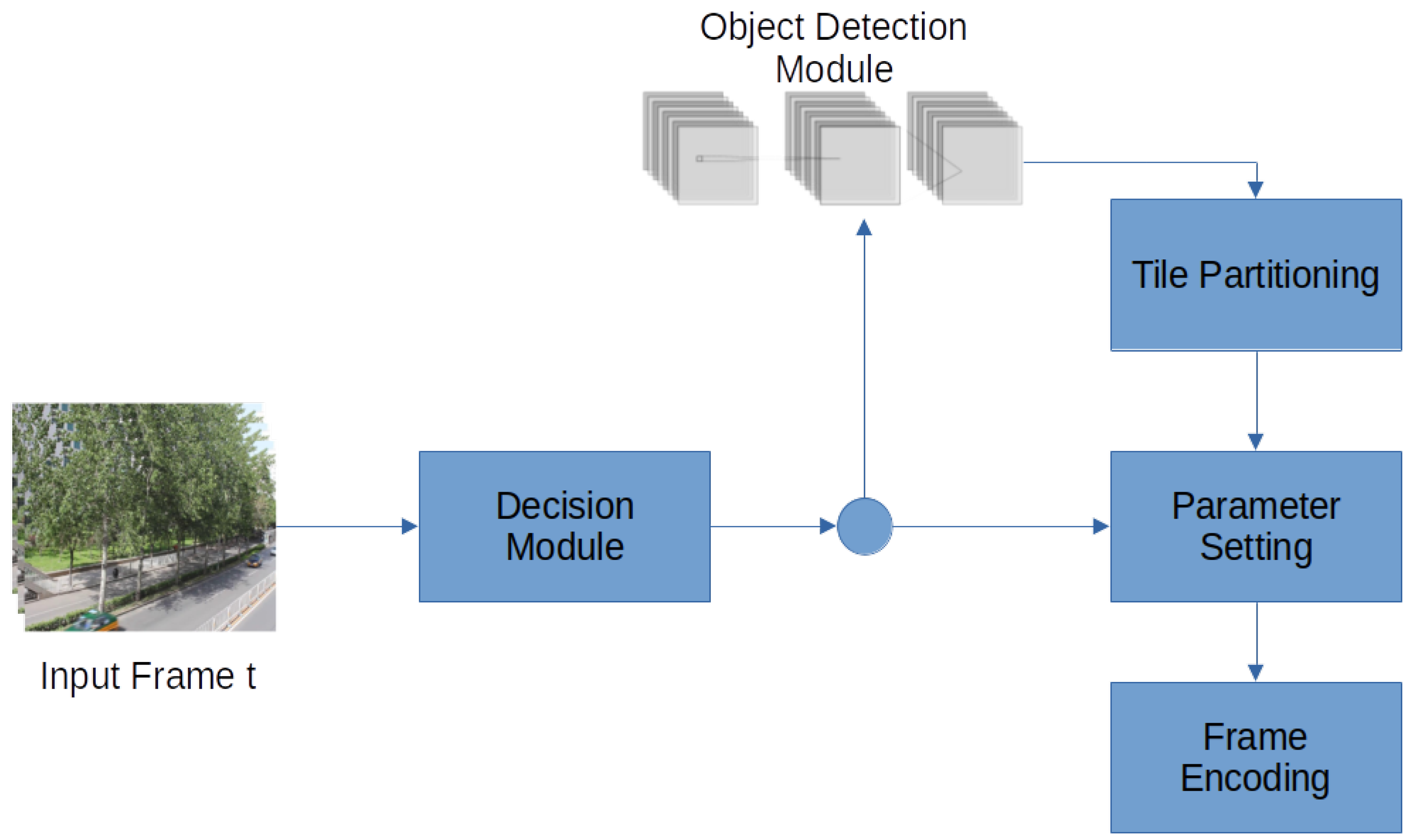 Object detection comes at a computational cost. Therefore, a per frame invocation strategy, although being the most adaptive in scene changes, might result in excessive processing delays. Moreover, many of these invocations might be redundant, since a total change of scene and object involvement on every frame is rather a seldom event. In this subsection, we describe the Decision Module which is responsible for defining whether object detection and subsequent optimizations (tile partitioning, etc.) should take place or not.