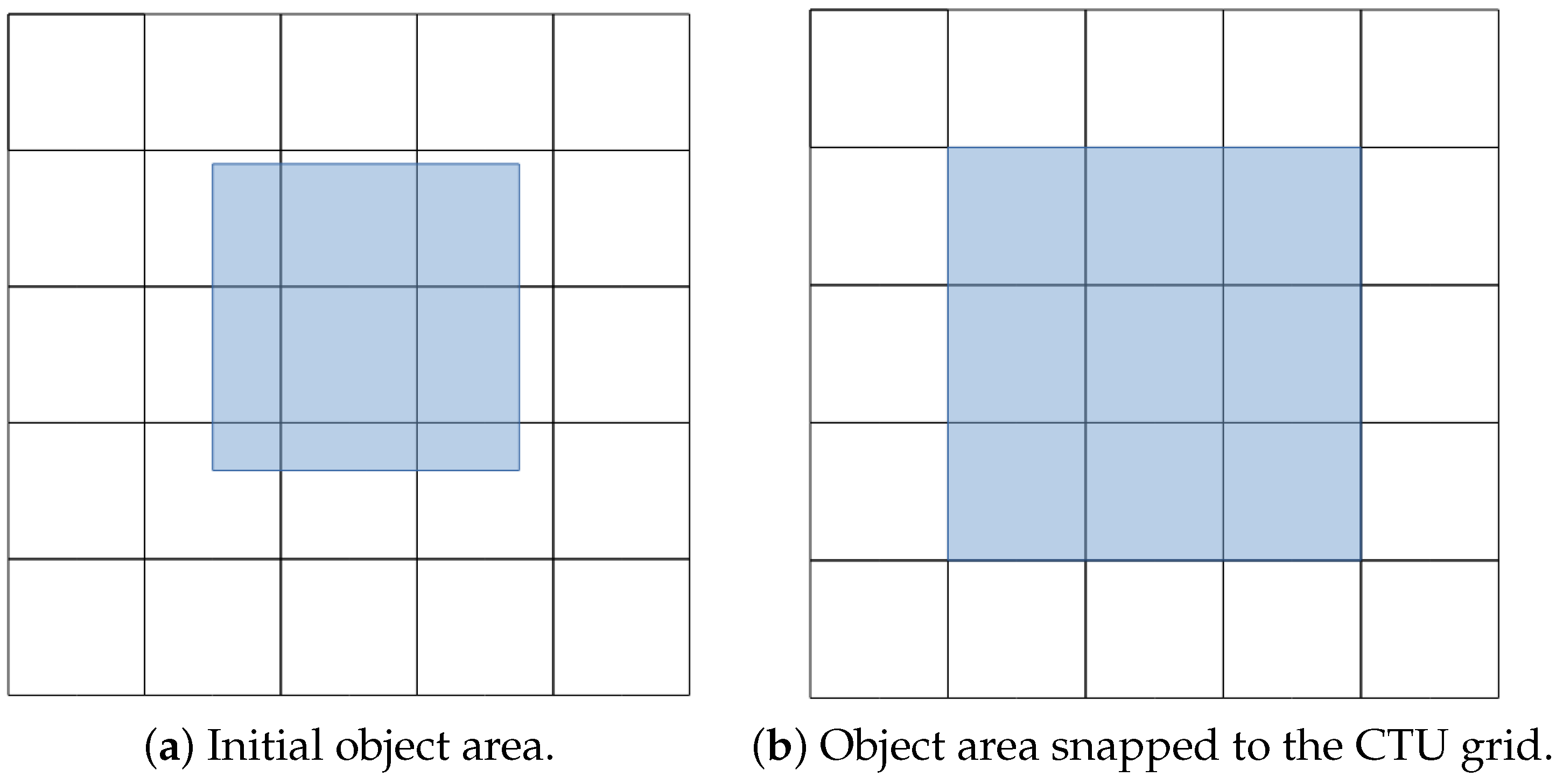 During this process, the frame is sent to the DNN. The DNN’s output consists of a mask as well as a minimum bounding box area for each object present in the image. We solely work with the bounding box areas of the objects. In order to comply with the VVC standard, we snap the rectangular areas of the objects to the CTU grid according to Equation (