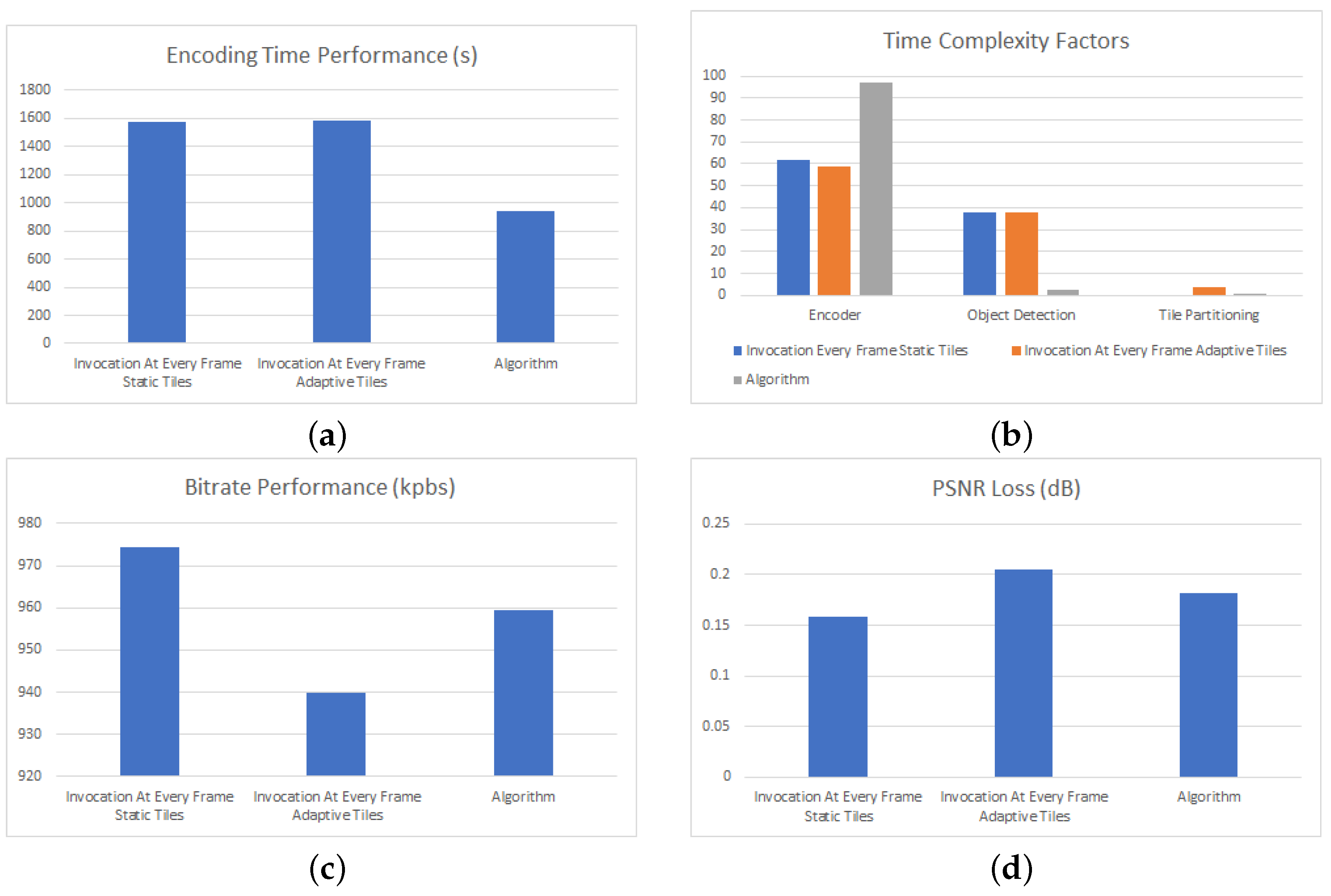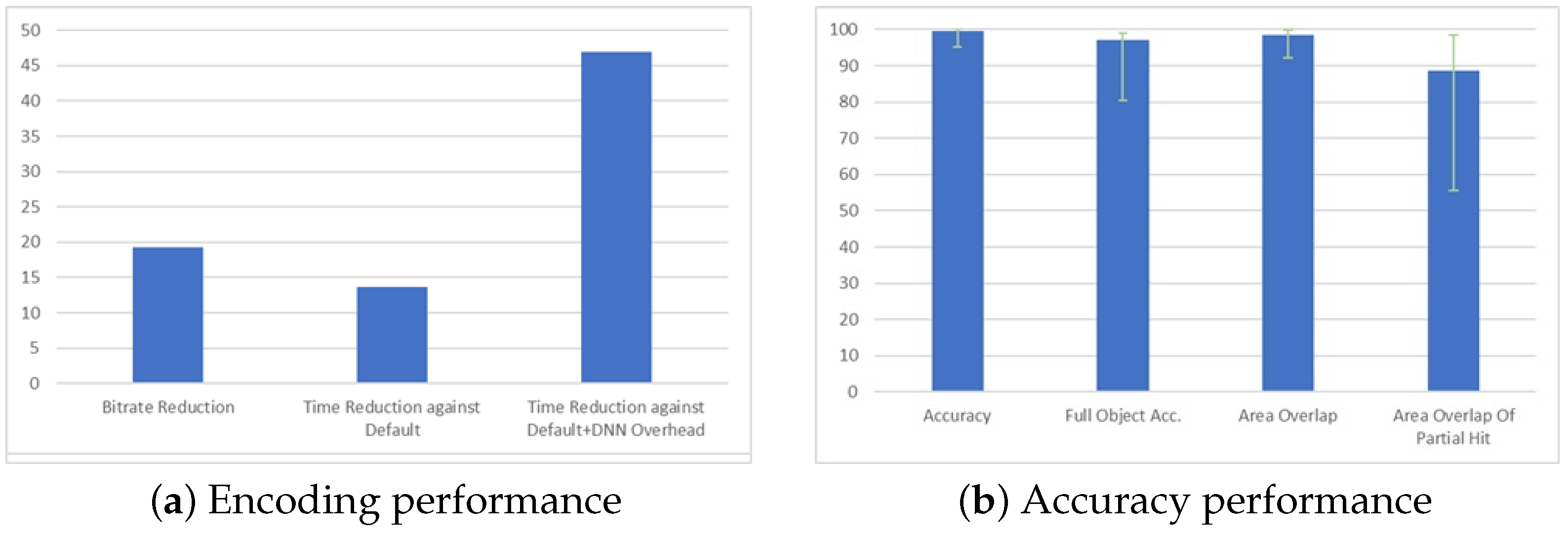 11], an average reduction of more than 13% in processing time and 19% in bitrate were recorded against a default encoding scheme with identical coding parameters, performing no object detection. These results highlight the merits of our approach, especially since the comparison was against a scheme with no object detection overhead. Furthermore, these merits come at a very small loss in accuracy of roughly 1%. Comparison with simpler variations and related work further establishes our algorithm as a valid trade-off between accuracy and other performance metrics. Last but not least, we should note that our methodology is not Deep Neural Network (DNN)-dependent (any object detection module could be incorporated). It is also not video standard-dependent, as long as the standard supports tiles. For instance, it is applicable to both HEVC [