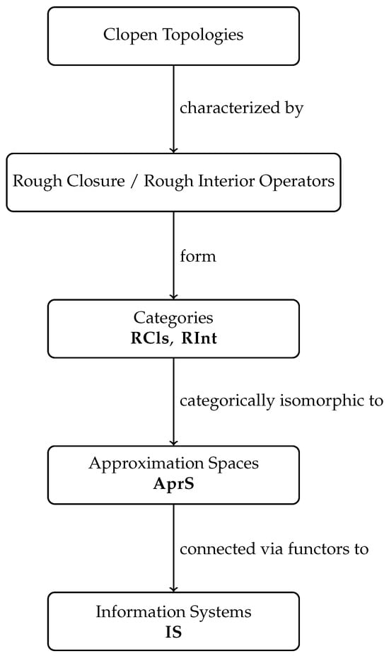 The diagram presents the conceptual structure of the paper in a top-down manner. Clopen topologies are characterized by rough closure and interior operators. These operators naturally form the categories and , which have been shown to be categorically isomorphic to the category of approximation spaces . Approximation spaces are linked to information systems through appropriate functors.