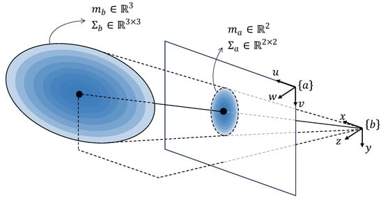 Figure 1. Perspective projection of a 3D ellipsoid onto the image plane. The ellipsoid in the camera frame { b } is characterized by mean m b R 3 and covariance Σ b R 3 × 3 . Through perspective projection, this ellipsoid induces a 2D Gaussian in the image-aligned frame { a } with mean m a R 2 and covariance Σ a R 2 × 2 .