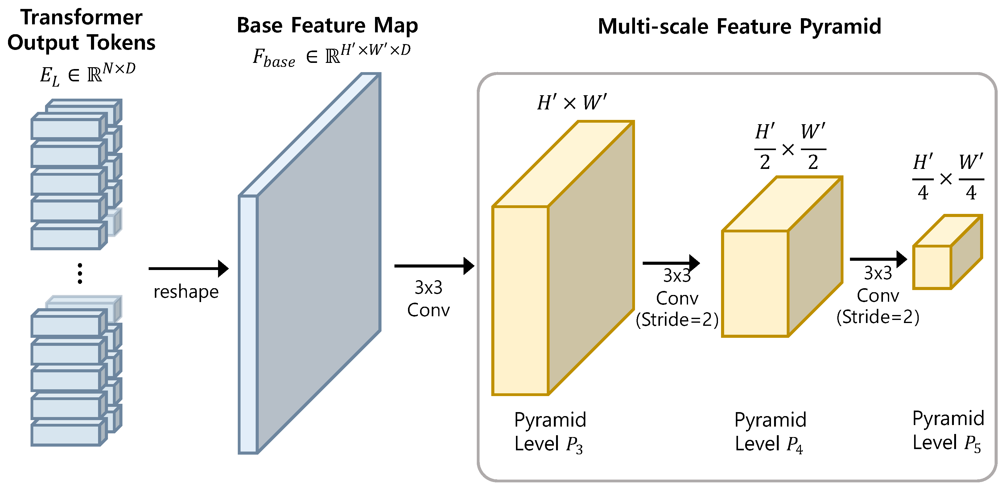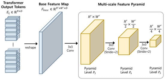 Figure 3. Detailed architecture of the Feature Refinement Neck. Transformer output tokens are reshaped into a 2D base feature map F base , followed by two strided 3 × 3 convolutions to generate a multi-scale pyramid { P 3 , P 4 , P 5 } . This pyramid supports detection of objects at different scales while maintaining the global context preserved by the transformer.