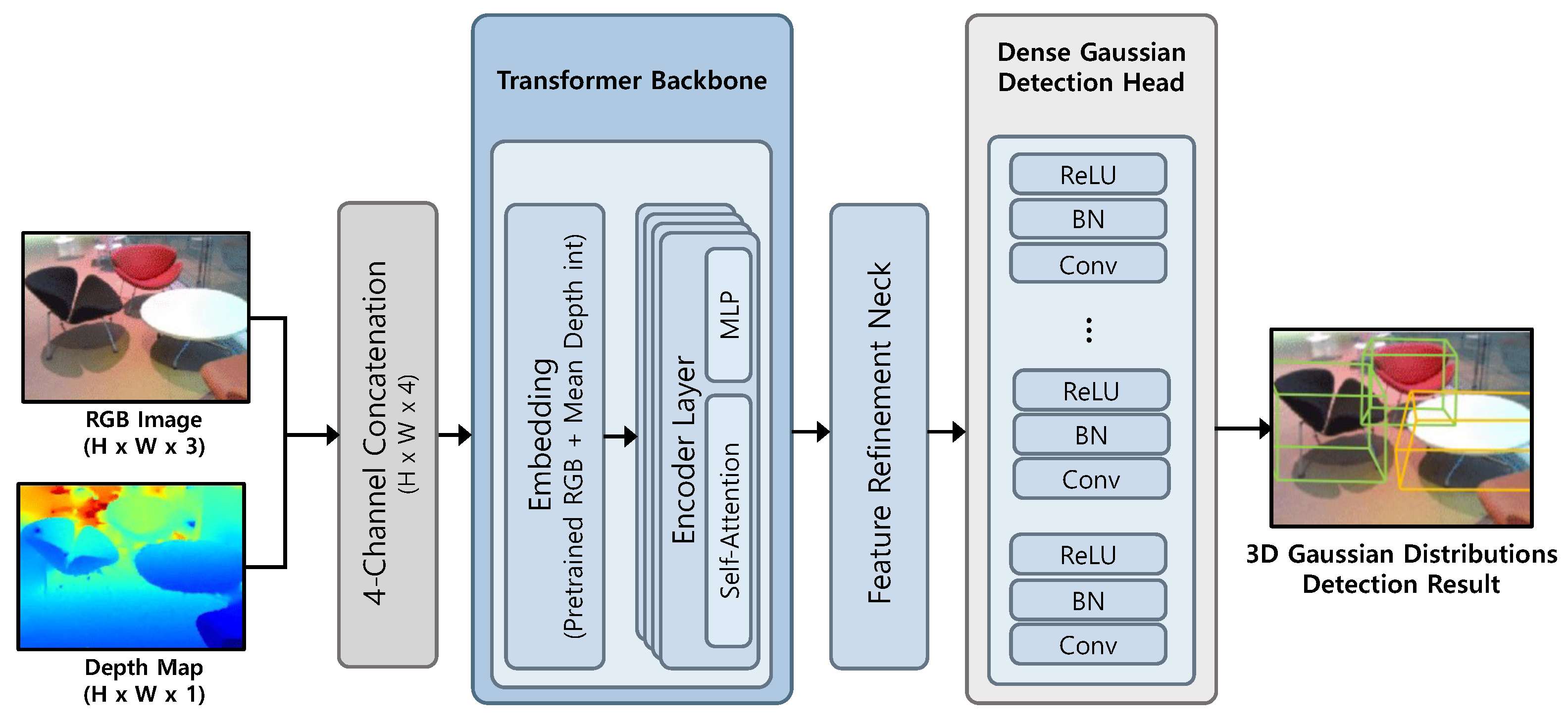 Recently, several works have reformulated detection as a density estimation problem, modeling each object as a Gaussian (or mixture) distribution over the image or 3D space rather than as a fixed box [1,2]. Modeling the object region via a Gaussian representation allows a more flexible uncertainty representation and can lead to improved alignment with evaluation metrics such as IoU or generalized divergence losses. In parallel, RGB-D sensing (i.e., combining color images with depth channels) has emerged as a powerful modality for 3D object detection tasks, enabling richer geometric cues than single-modal RGB. Standard approaches in the RGB-D domain often process RGB and depth streams separately, fusing them only at a later stage. Alternatively, some methods extract 2D image proposals first and then refine them using depth information [3,4]. While effective, these strategies incur a modality gap and require separate processing steps.