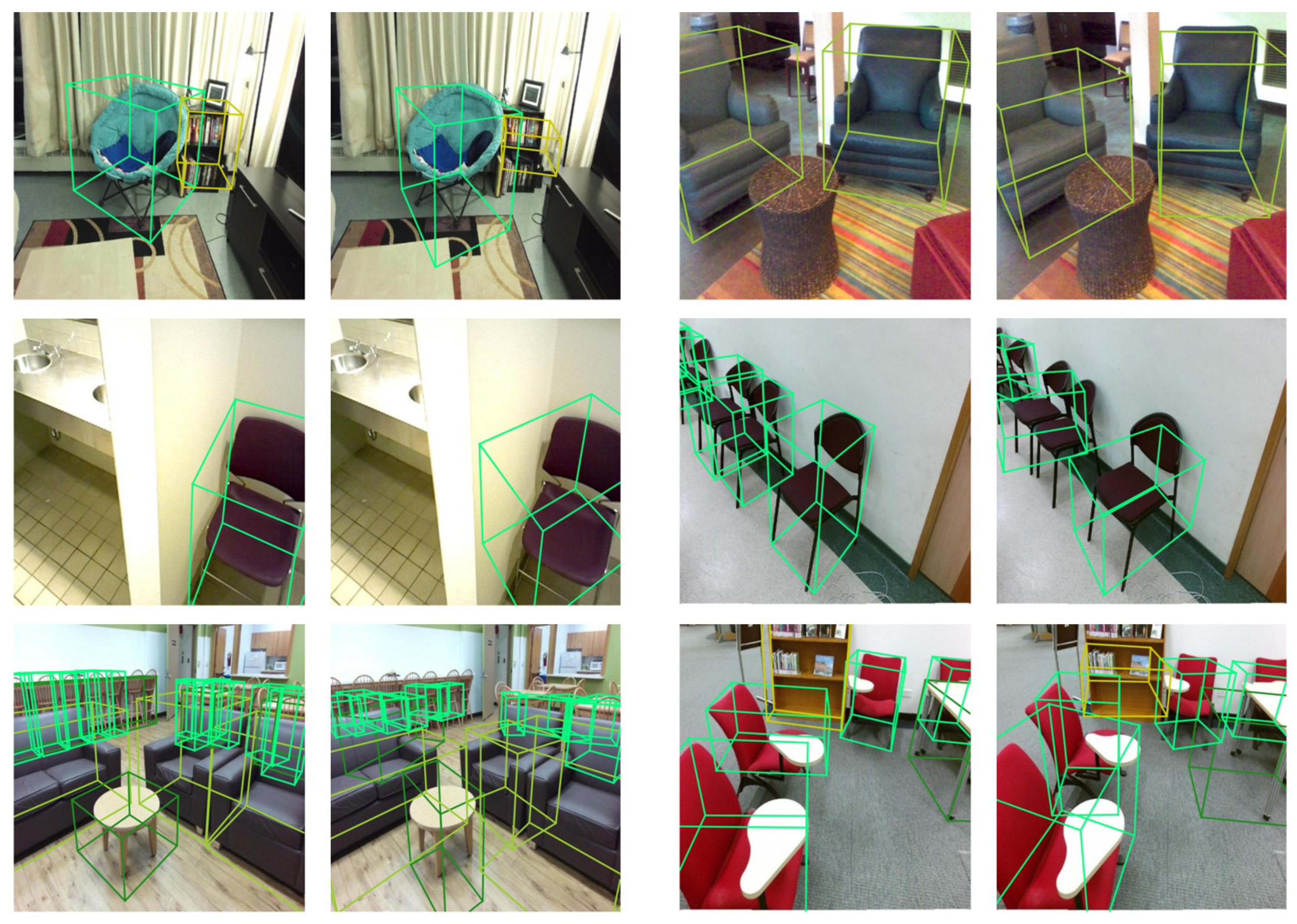 Figure 4. Qualitative evaluation results of 3D bounding box prediction on SUN RGB-D. In each pair, the left image shows the ground truth annotations, and the right image shows the prediction results of our method. The predicted 3D bounding boxes closely align with object geometries, demonstrating accurate localization across diverse indoor scenarios including bedrooms, living rooms, and offices. The detection results are visualized using bounding boxes in different colors for each object.