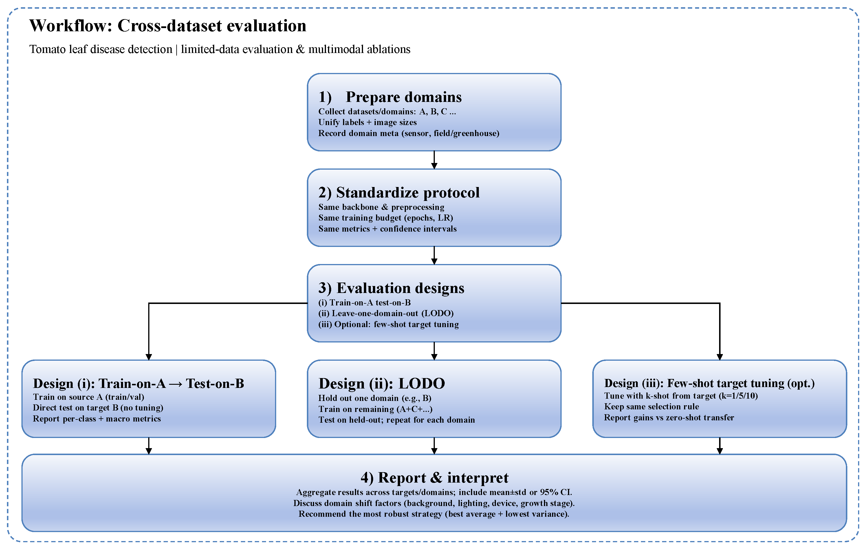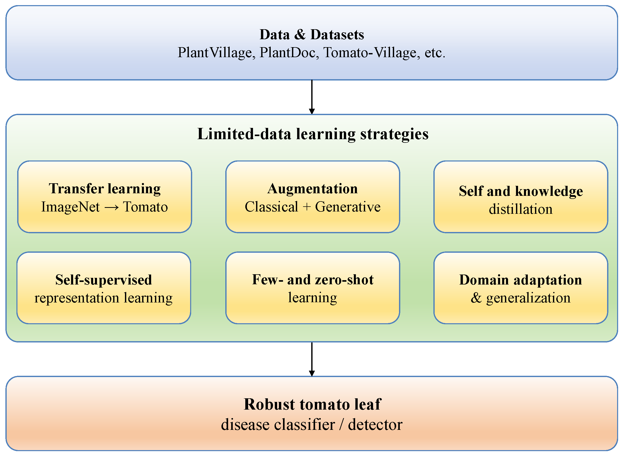 | Search strategy | Keyword search on tomato leaf disease detection, limited data, few-shot/self-supervised learning, domain generalization, multimodal fusion. |