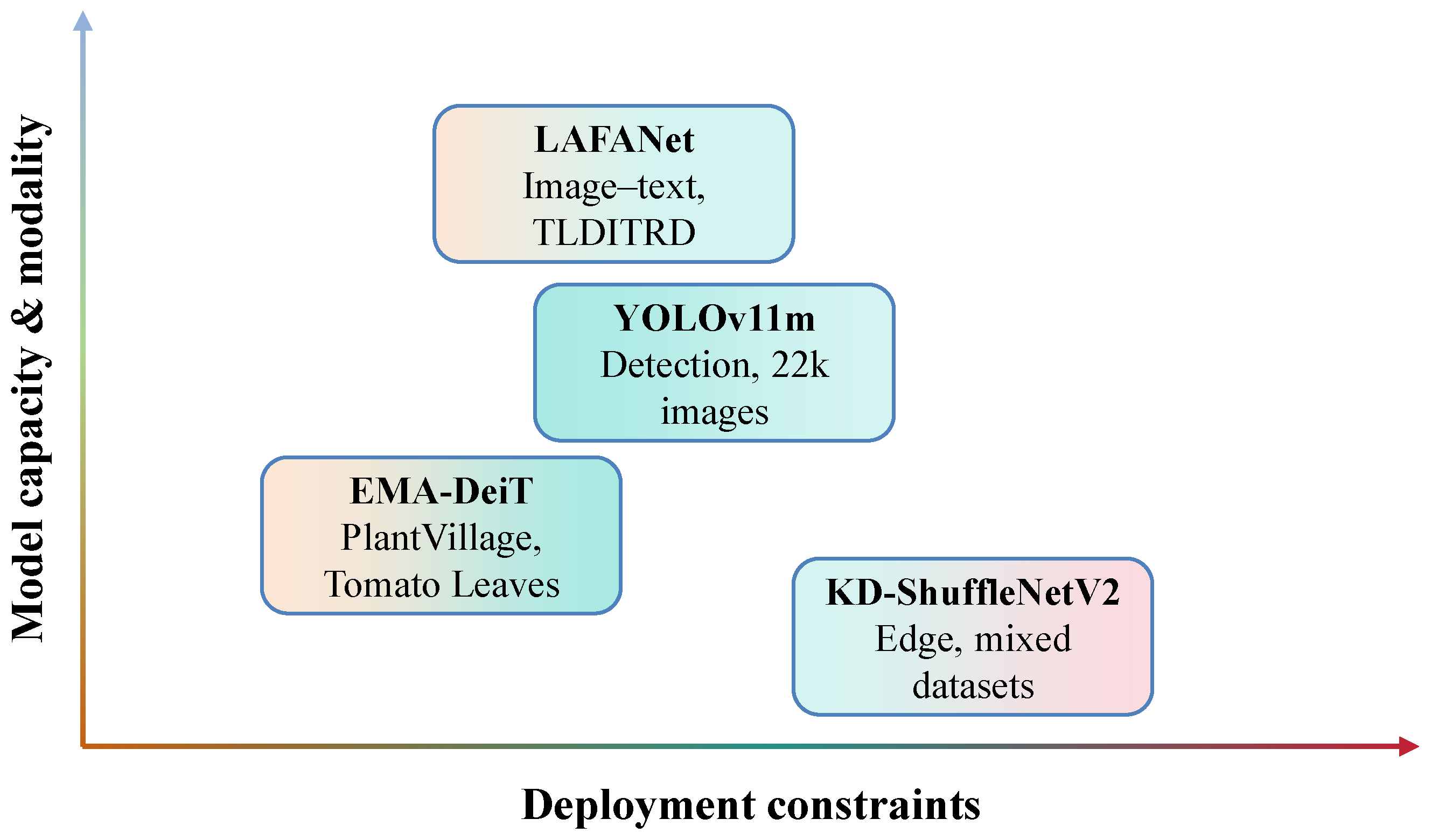 | KD-ShuffleNetV2 [37] | Classification | Aggregated multi-source tomato datasets | ∼95% accuracy; ∼1.27 M params; edge-friendly with self-distillation gains. |