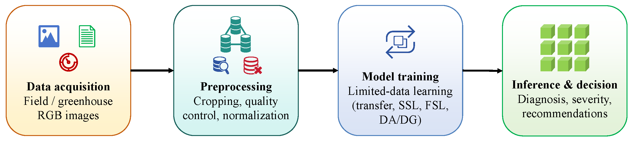 | Small sample size | Overfitting to few labeled images; poor generalization to new fields or cultivars. | Transfer learning from large datasets; self-supervised pretraining on unlabeled field images; few-shot/meta-learning; active learning for expert labeling. |