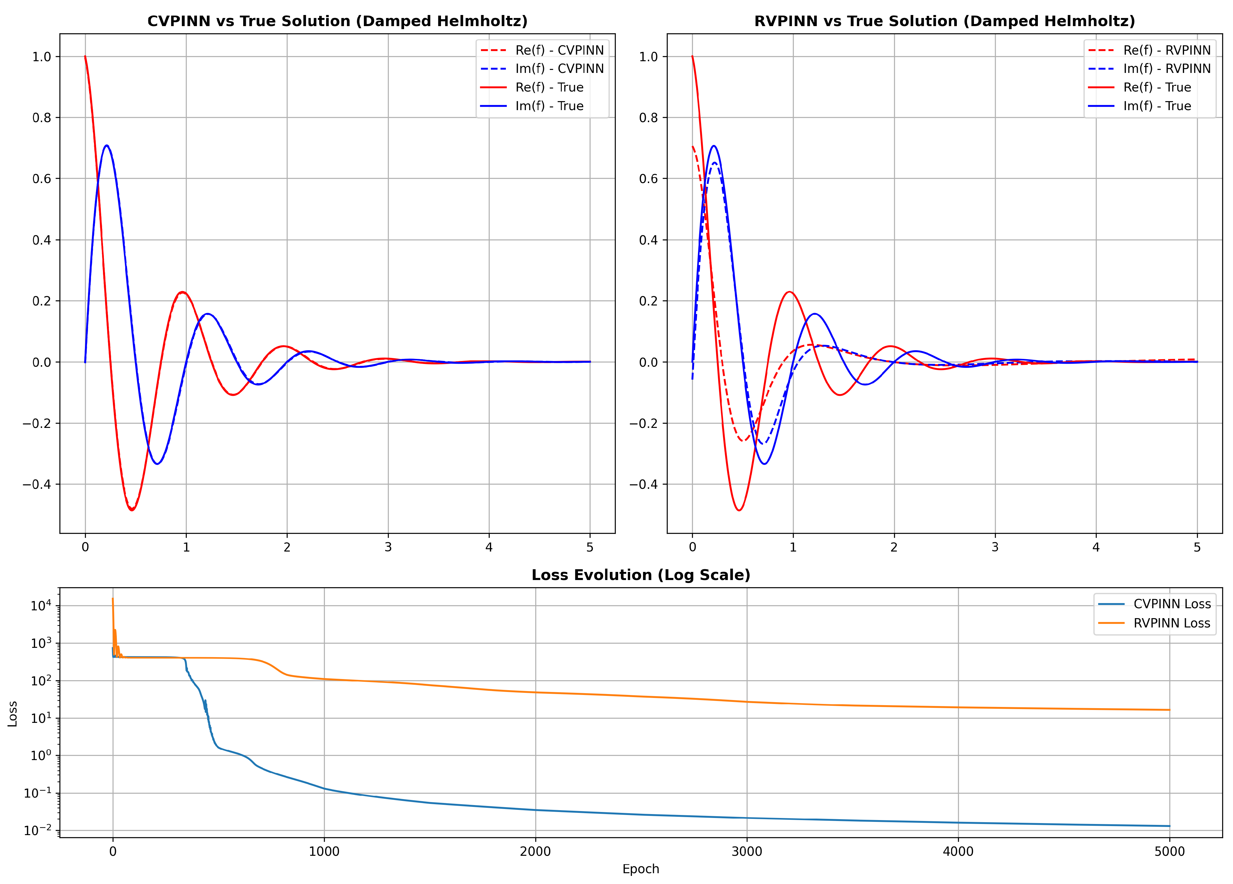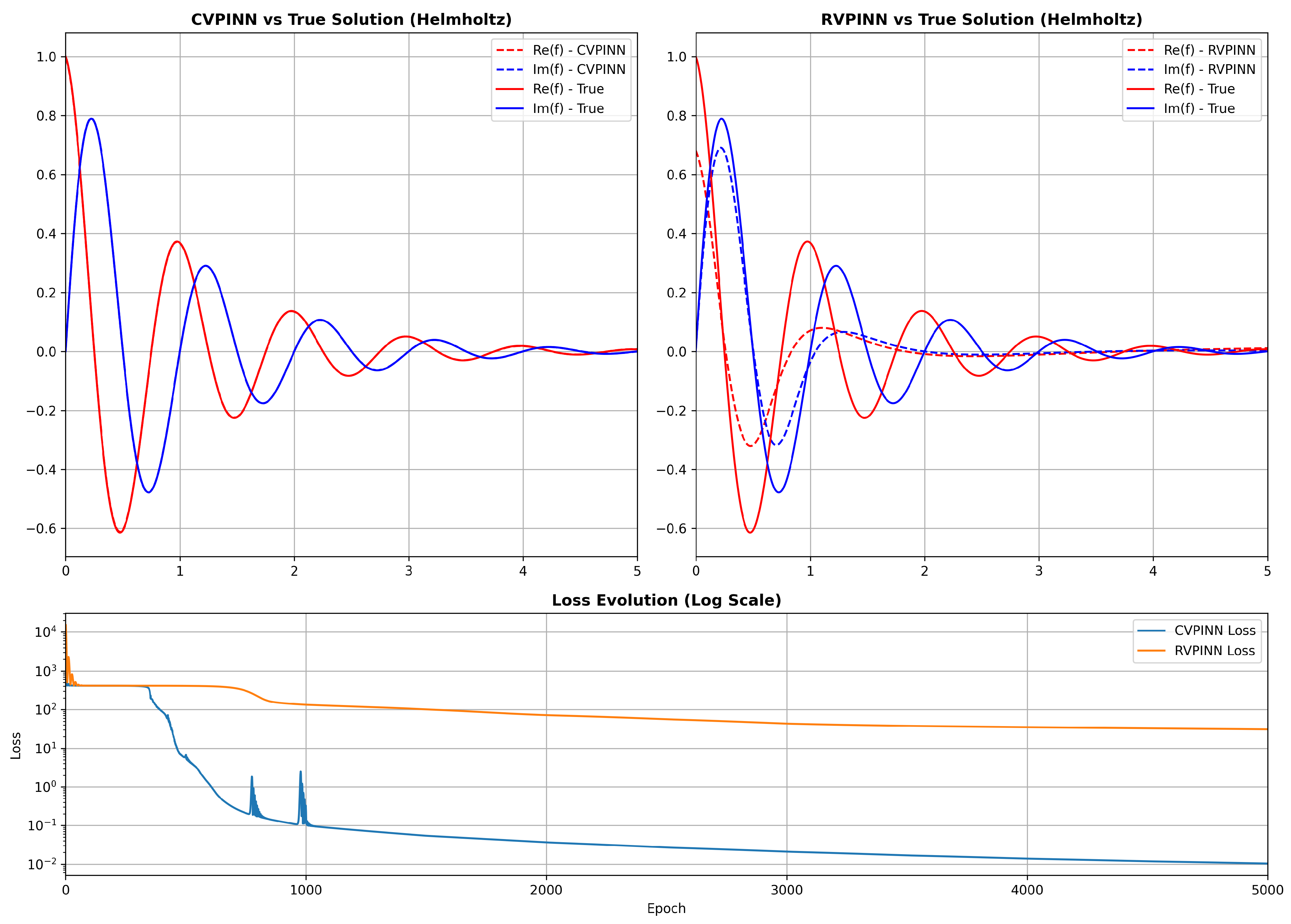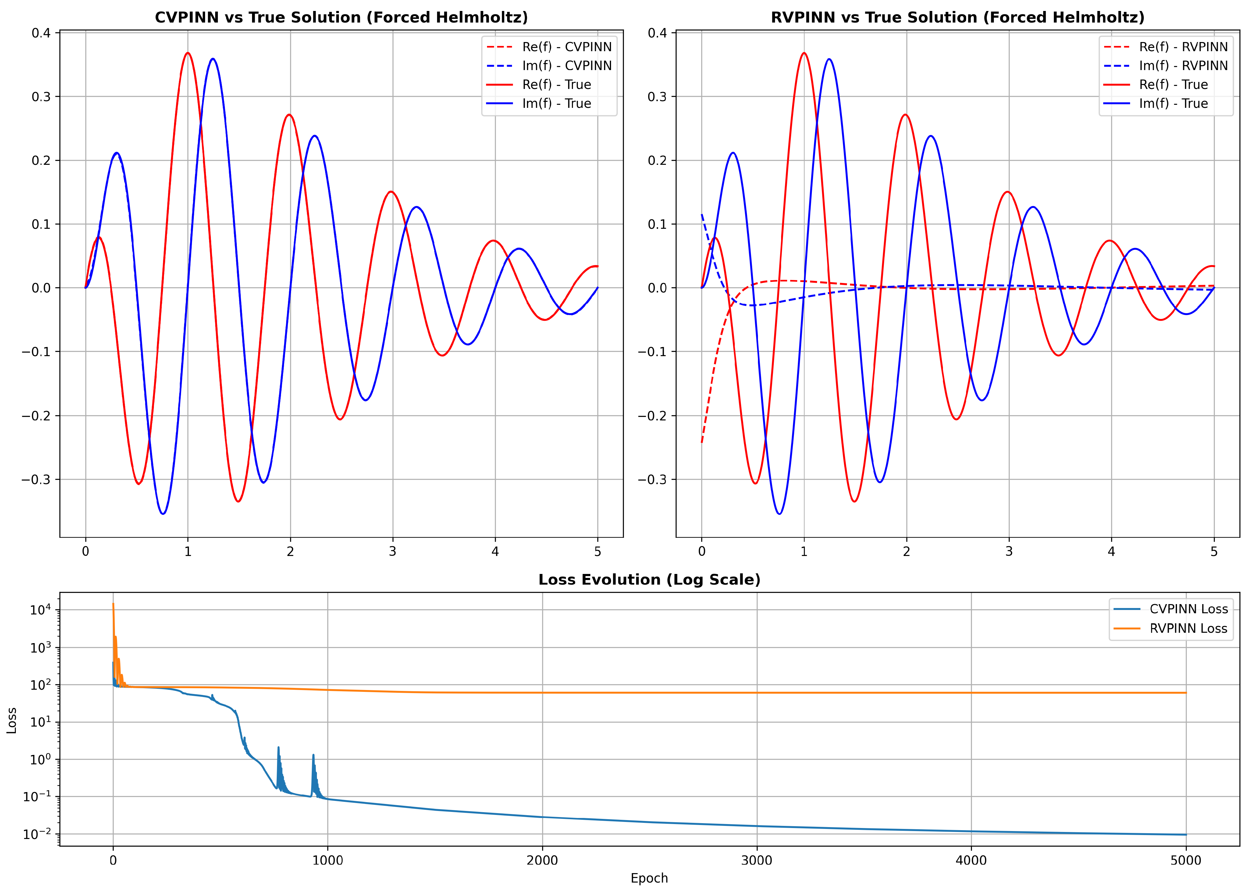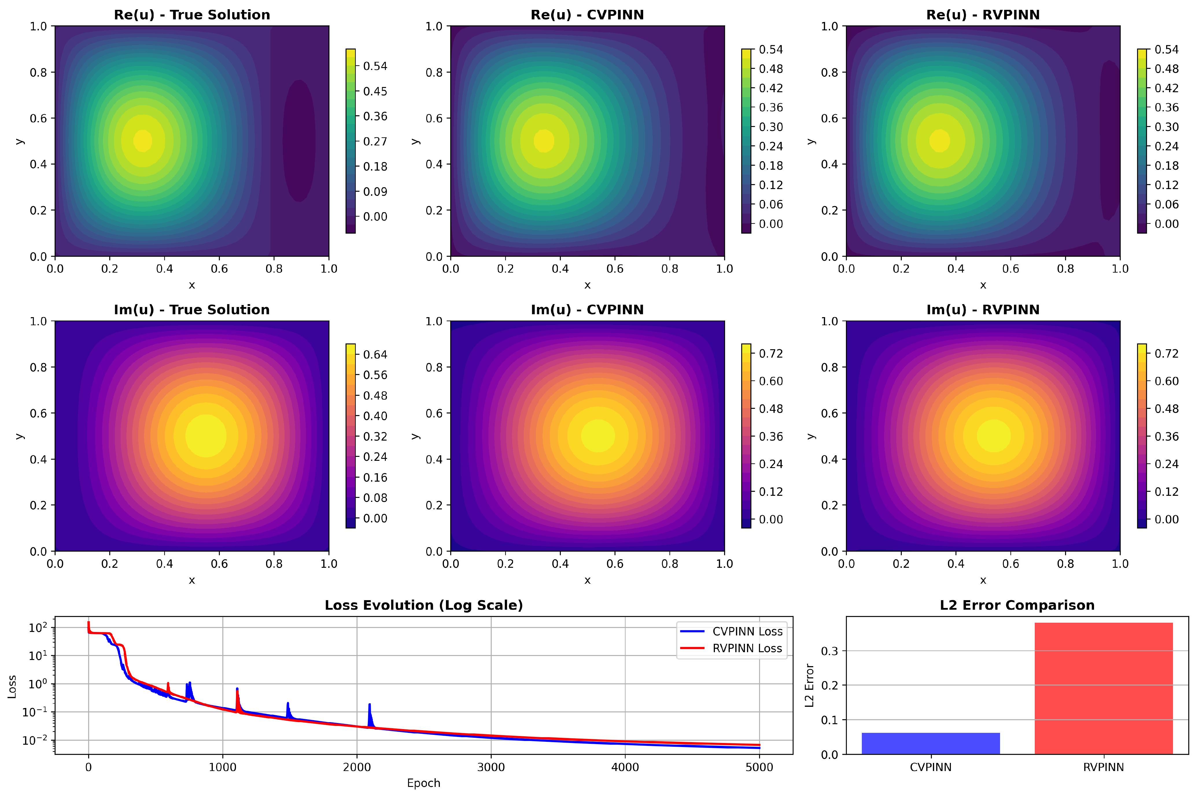 - The PDE residual inside the domain. For the CVPINN, this isFor the RVPINN, the complex PDE is split into two coupled real equations for the real and imaginary components.