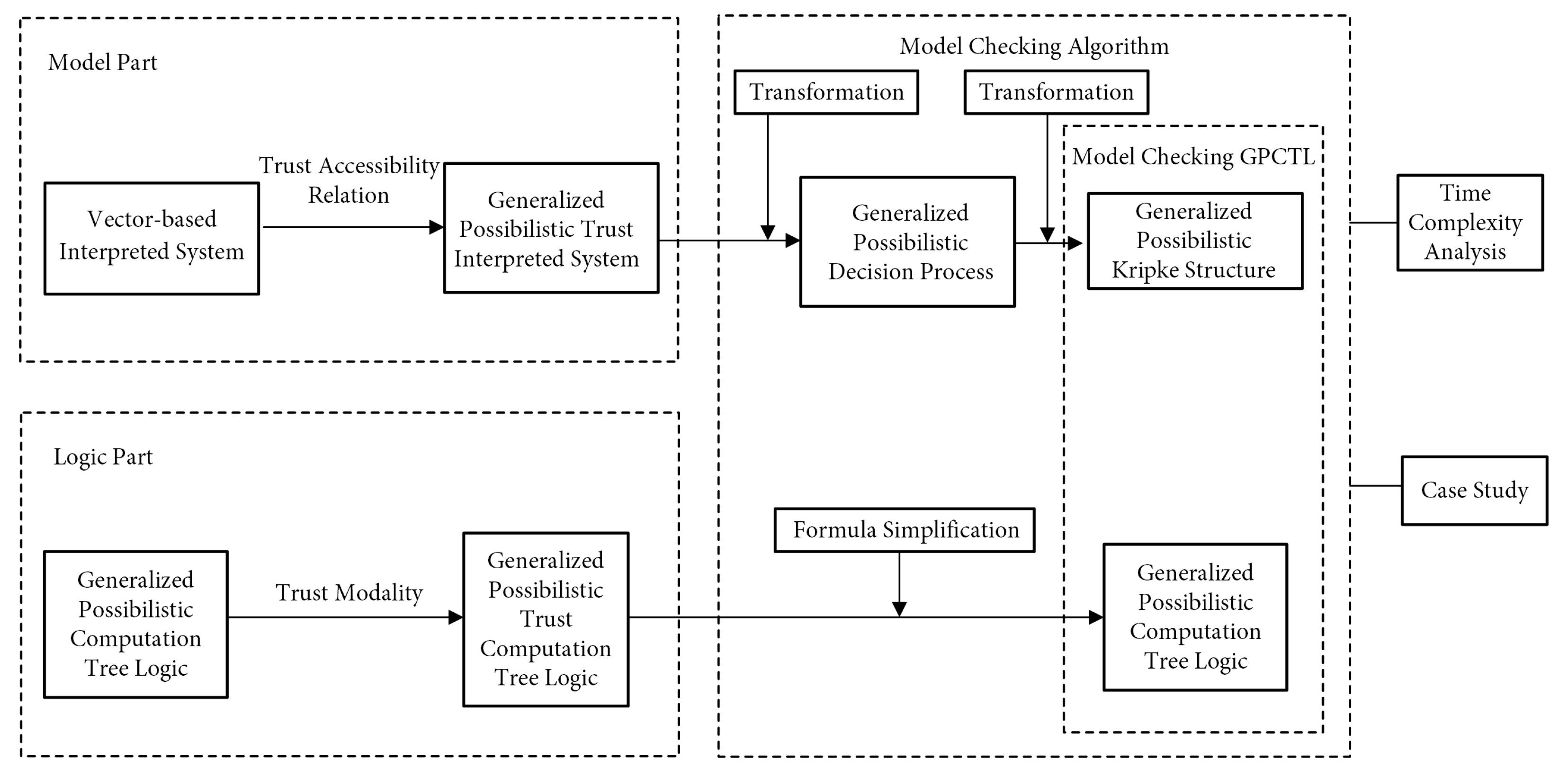 Model checking is an automated formal verification technique used to determine whether a system satisfies specific properties. It has been extensively adopted for safety verification in MASs [7,8]. Since the development of model checking, both academia and industry have continuously worked to expand its applicability to more complex systems. Traditional model checking approaches reply on temporal logic, particularly Computation Tree Logic (CTL) and Linear Temporal Logic (LTL), to specify system properties. However, temporal logic alone is insufficient to express trust-related attributes within MASs. To accurately describe communication behaviors among agents and meet the verification demands of MASs, trust operators have been integrated into temporal logic, thereby broadening the applicability of model checking techniques.