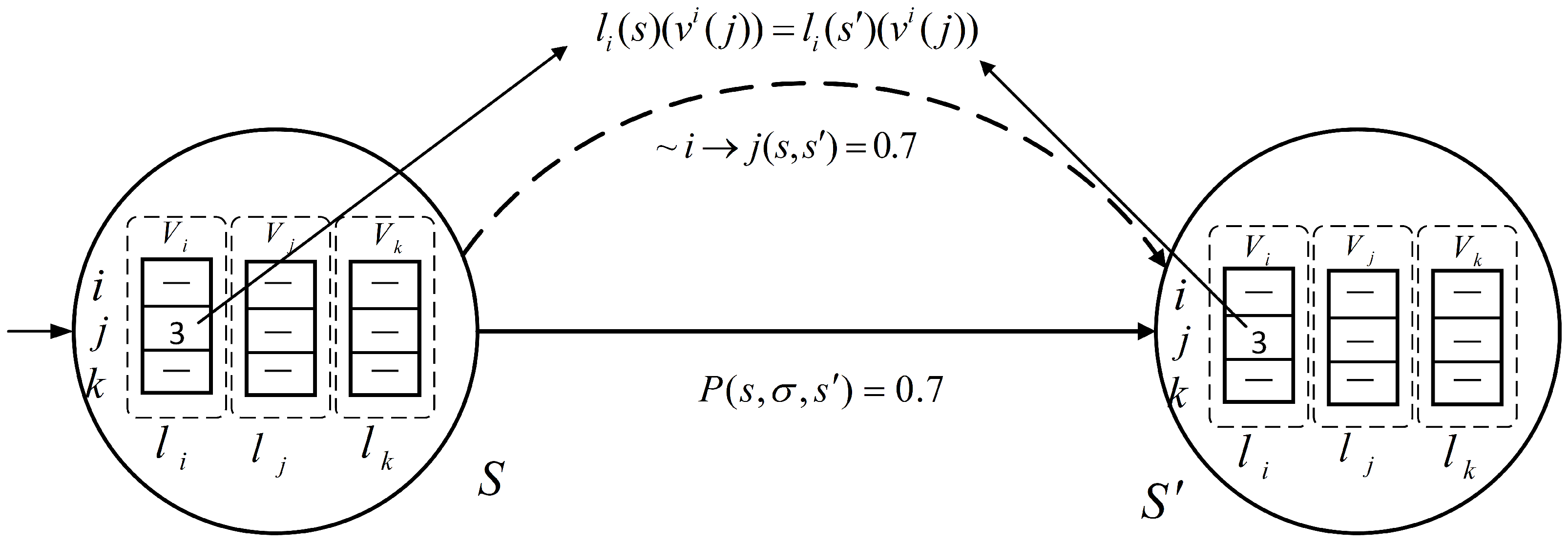 Figure 2 illustrates the dashed line representing the possibility value of 0.7 for the trust accessibility relation from agent i to agent j in the transition from global state s to global state s . Here, l i ( s ) ( v i ( j ) ) = l i ( s ) ( v i ( j ) ) denotes that within the GPTIS of these two states, the vector v i ( j ) has the same value, thus enabling the trust accessibility relation from i to j.
