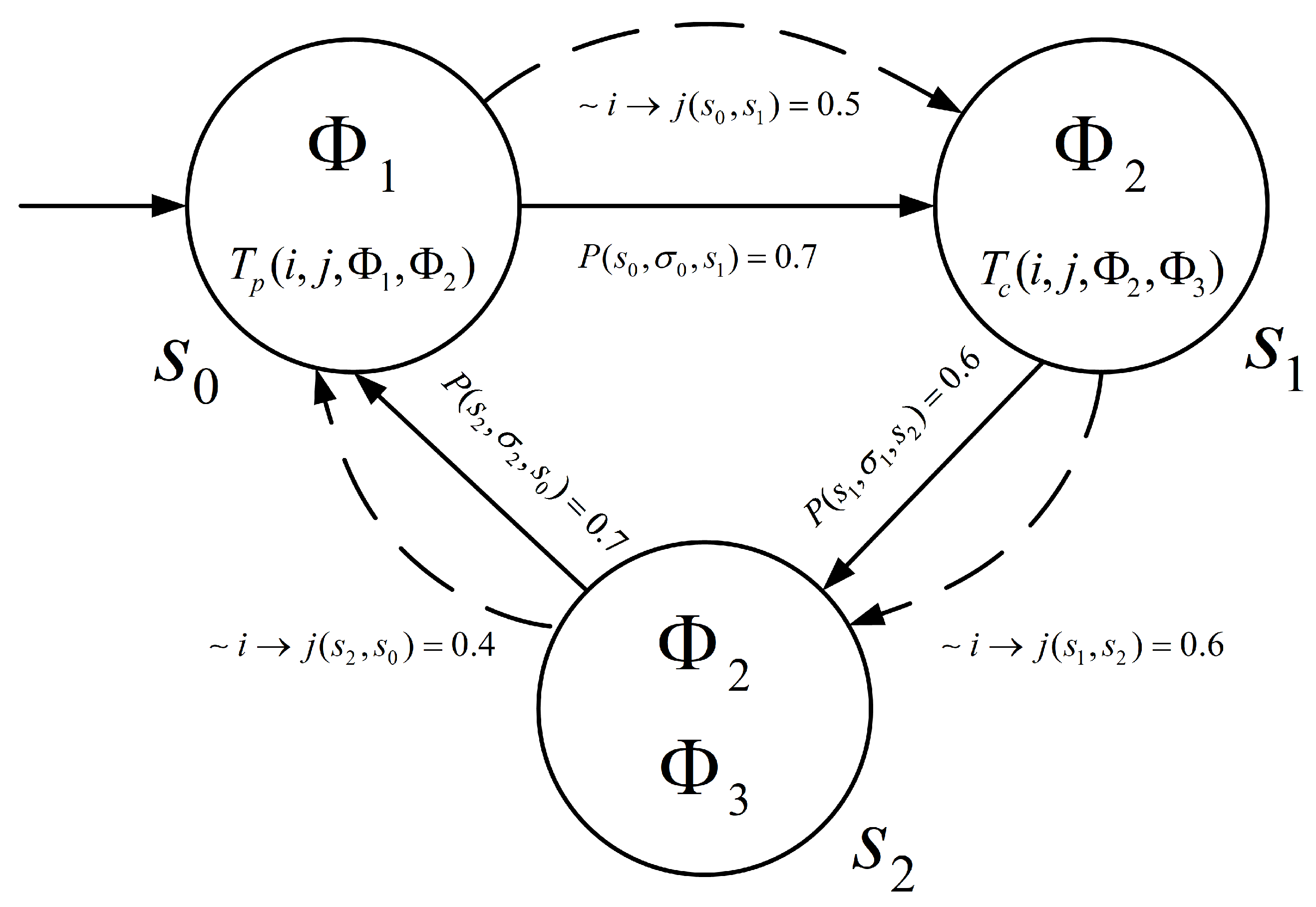 If | S | , | A P | , | A g t | are finite, then M is called a finite GPTIS. For a GPTIS M = ( S , P , I , L , A P , v i , i j ) , a finite path starting from state s 0 in M is denoted by the sequence π ^ = s 0 σ 0 s 1 σ 1 s 2 s n 1 σ n 1 s n . An infinite path starting from state s 0 in M is denoted by the sequence π = s 0 σ 0 s 1 σ 1 ( S × A c t ) w . The set of all infinite paths starting from global state s in M is denoted by P a t h s ( s ) . The set of all finite paths starting from the global state s in M is denoted by P a t h s f i n ( s ) . The set of all infinite paths in M is denoted by P a t h s ( M ) . The set of all finite paths in M is denoted by P a t h s f i n ( M ) .