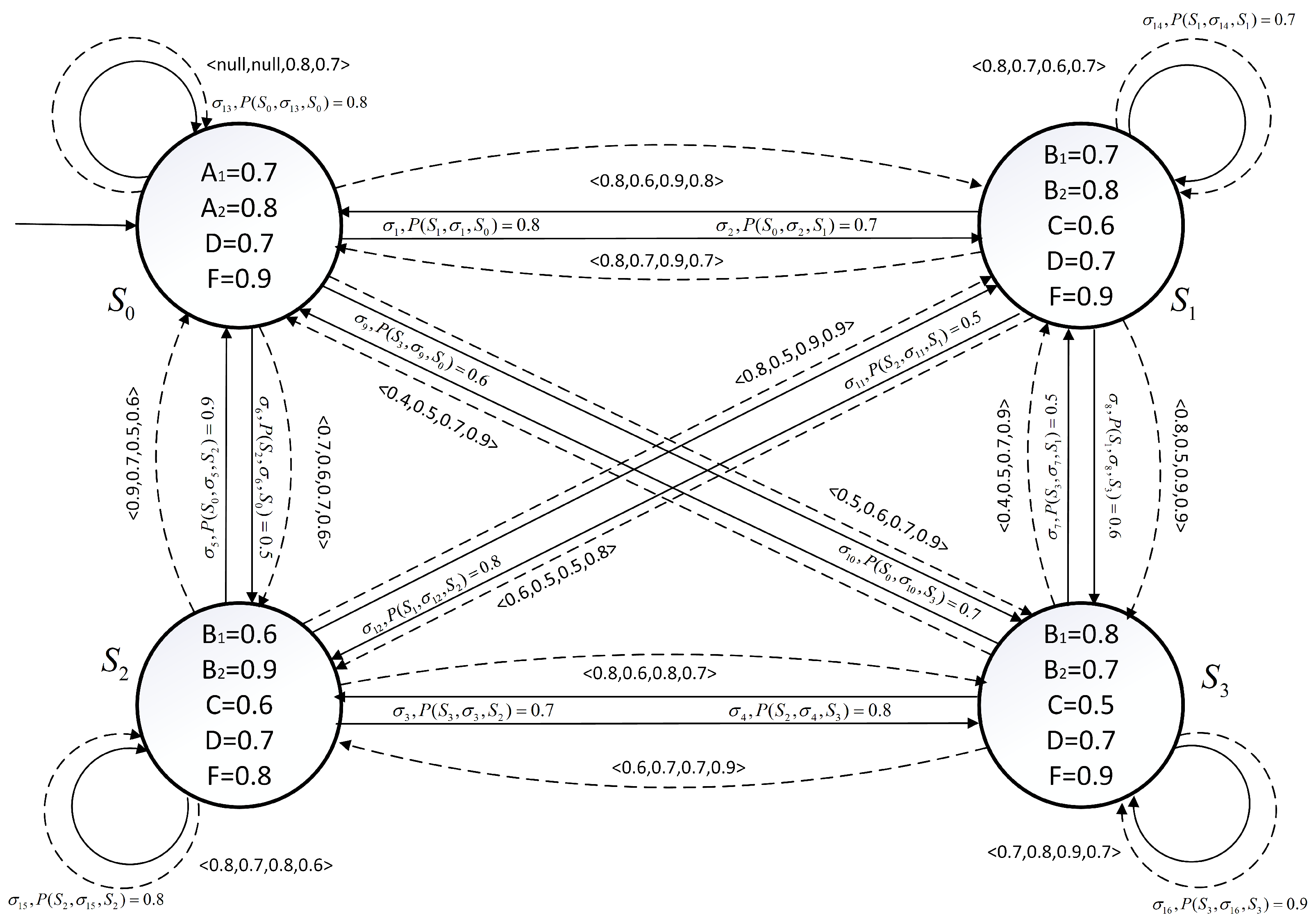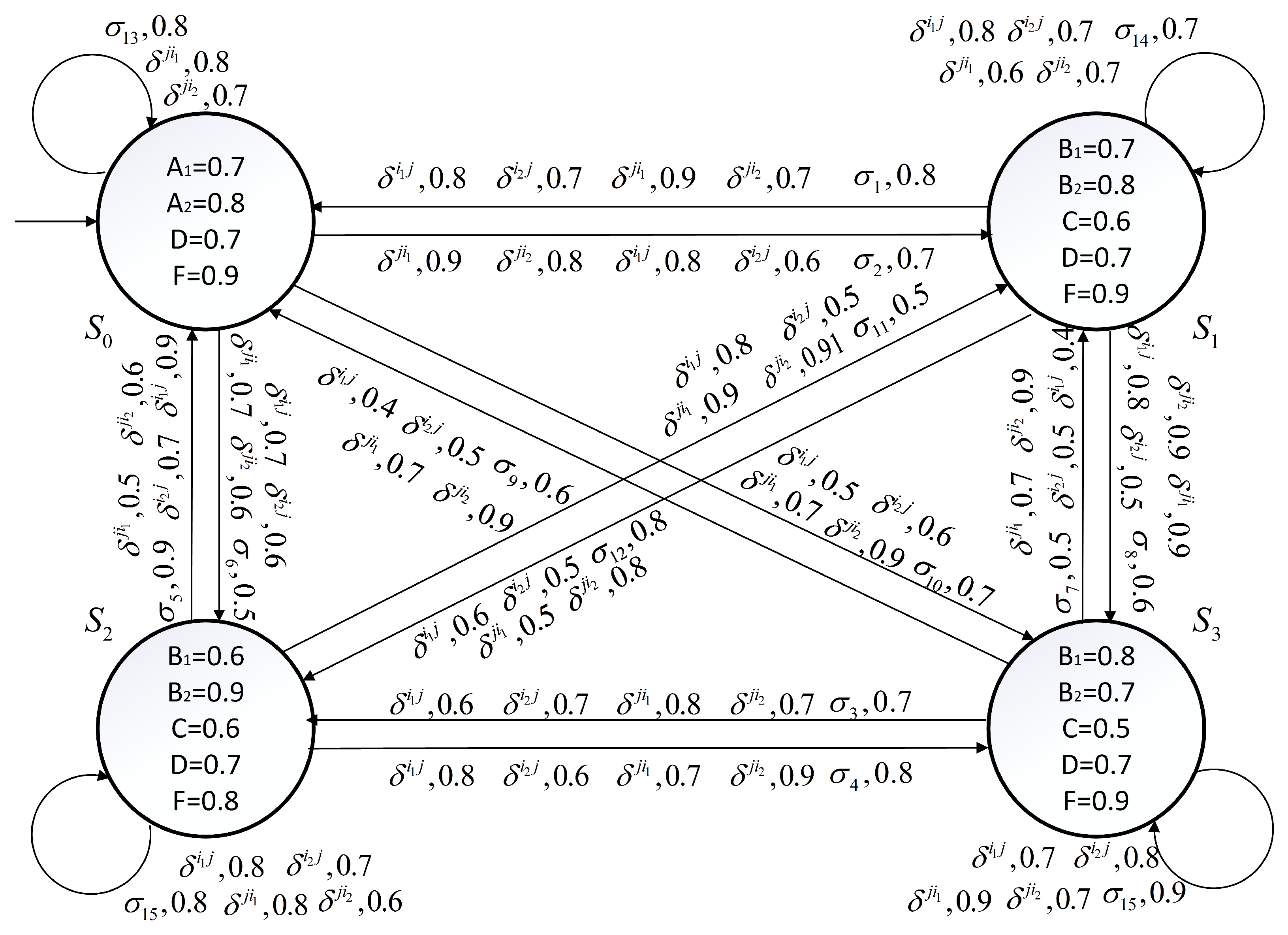 T p ( j , i 1 , F , B 1 ) max ( S 0 ) = 0.6 and T p ( j , i 2 , F , B 1 ) min ( S 0 ) = 0.6 are represented as, in state S 0 , the maximum possibility of the merchant shipping the order, given that customer j trusts the merchant and the customer has made the payment, which is 0.6, and the minimum possibility is also 0.6.