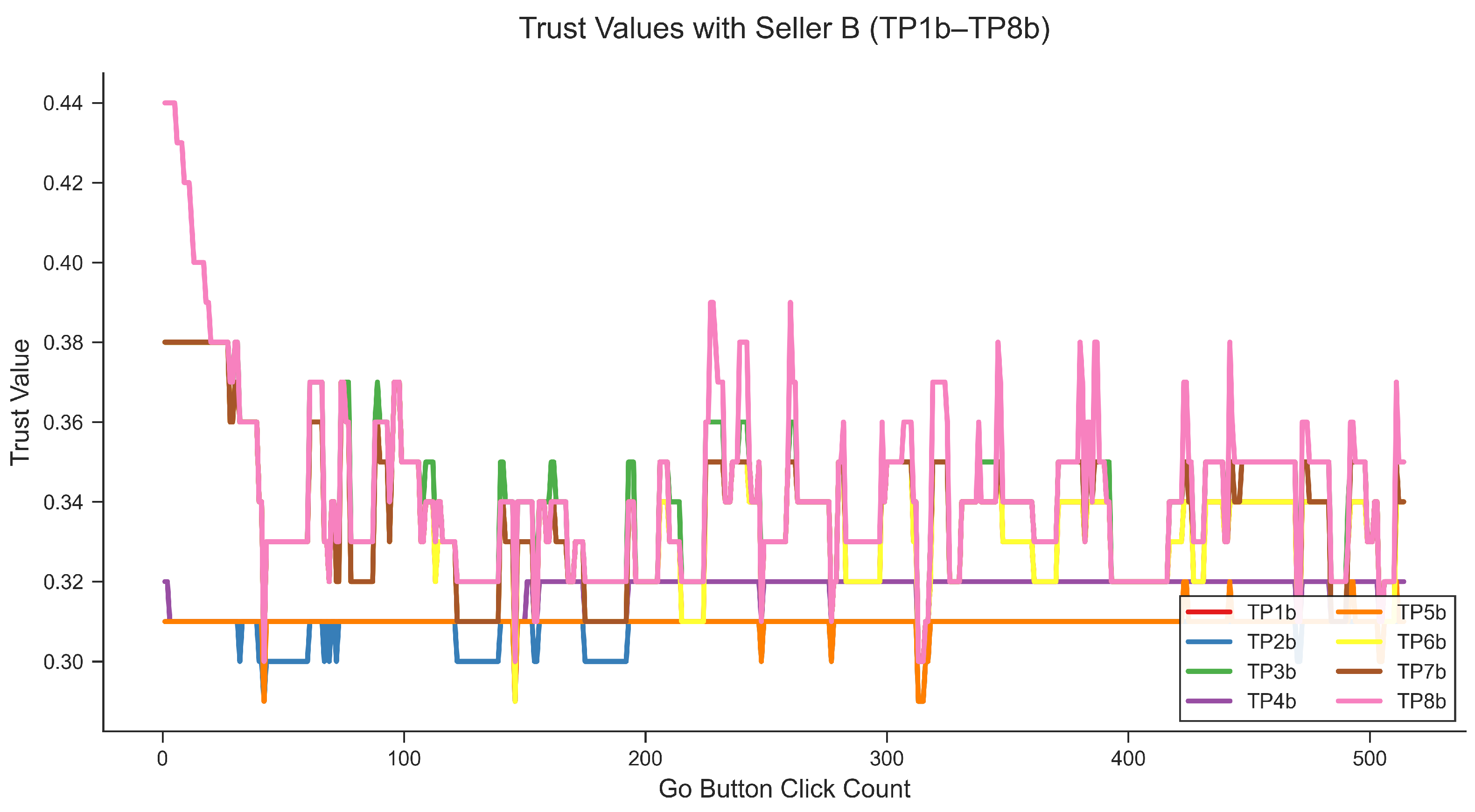 This study develops and implements a multi-agent trust interaction simulation system based on the NetLogo platform to model the dynamic interactions between a customer and two distinct sellers. In each simulation round, the customer randomly selects one of the sellers and randomly adopts one of eight trust evaluation types. Specifically, TP1 through TP8 denote the trust values computed between the customer and Seller A using the eight trust computation methods listed in the leftmost column of Table 2 in top-to-bottom order, while TP1b through TP8b denote the corresponding results for interactions with Seller B using the same set of methods.