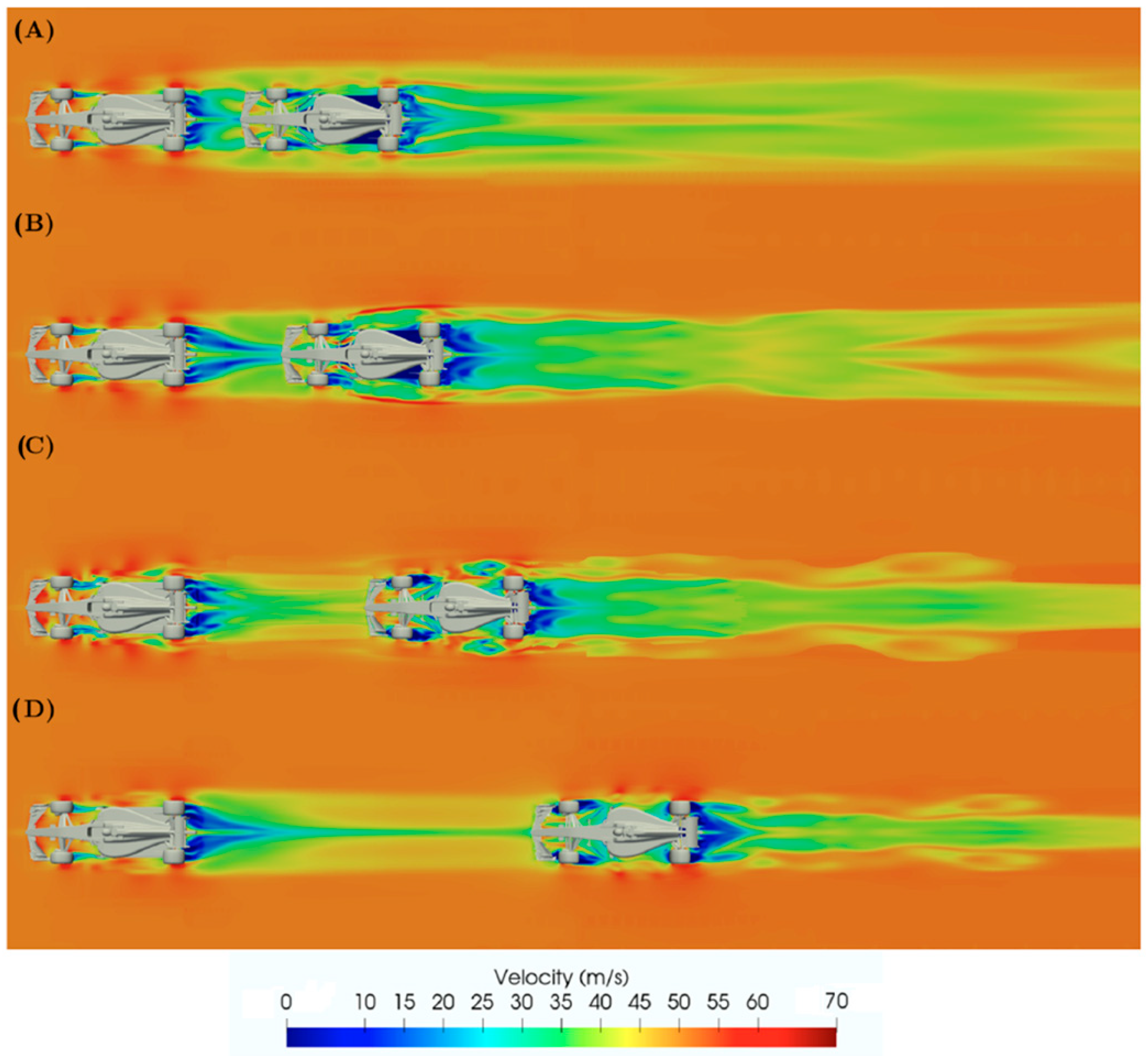 This timing reflects overtaking behaviour commonly observed in practice: cars follow closely in the wake to maximise drag reduction and then deliberately move laterally out of the wake under braking to avoid instability and recover braking performance. The simulation, therefore, captures a key physical mechanism governing overtaking in modern Formula racing.