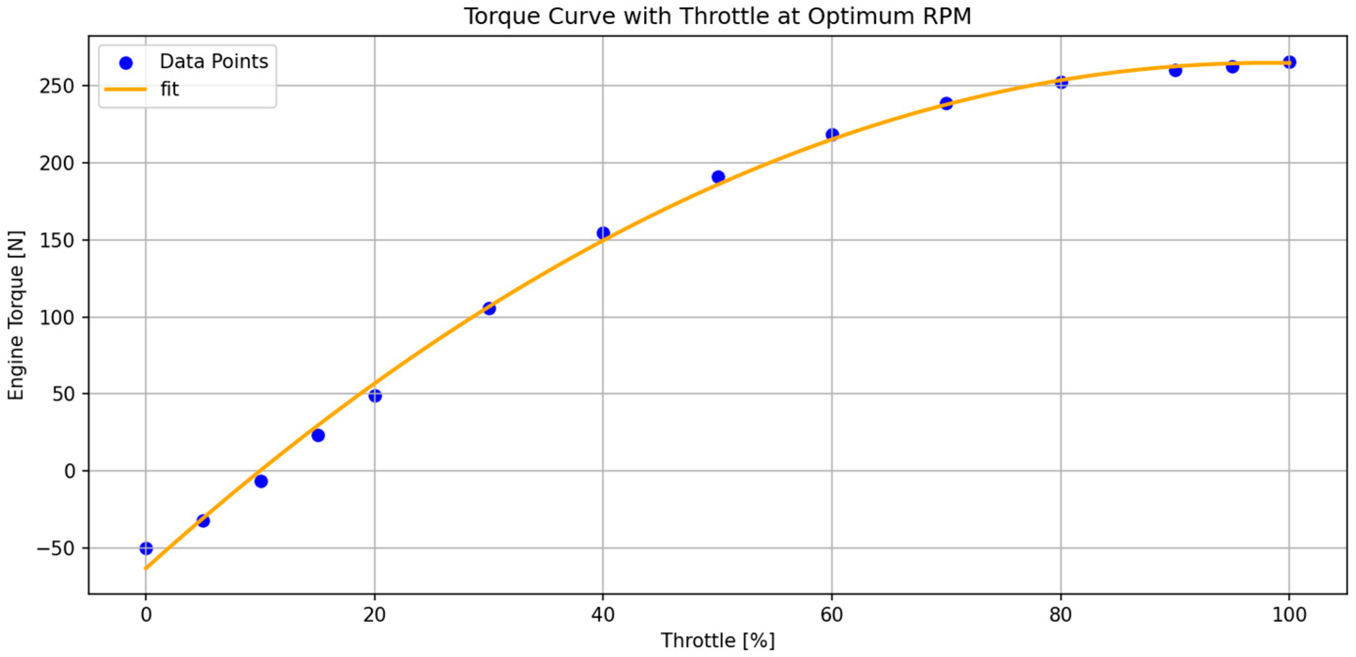 Engine torque data are derived from an AVL-generated Formula 3 engine model (AVL List GmbH, Graz, Austria) and approximated using third-order polynomial fitting in throttle and engine speed to allow smooth integration within the optimal control framework. The variation of engine torque with throttle input and the corresponding polynomial fit are shown in