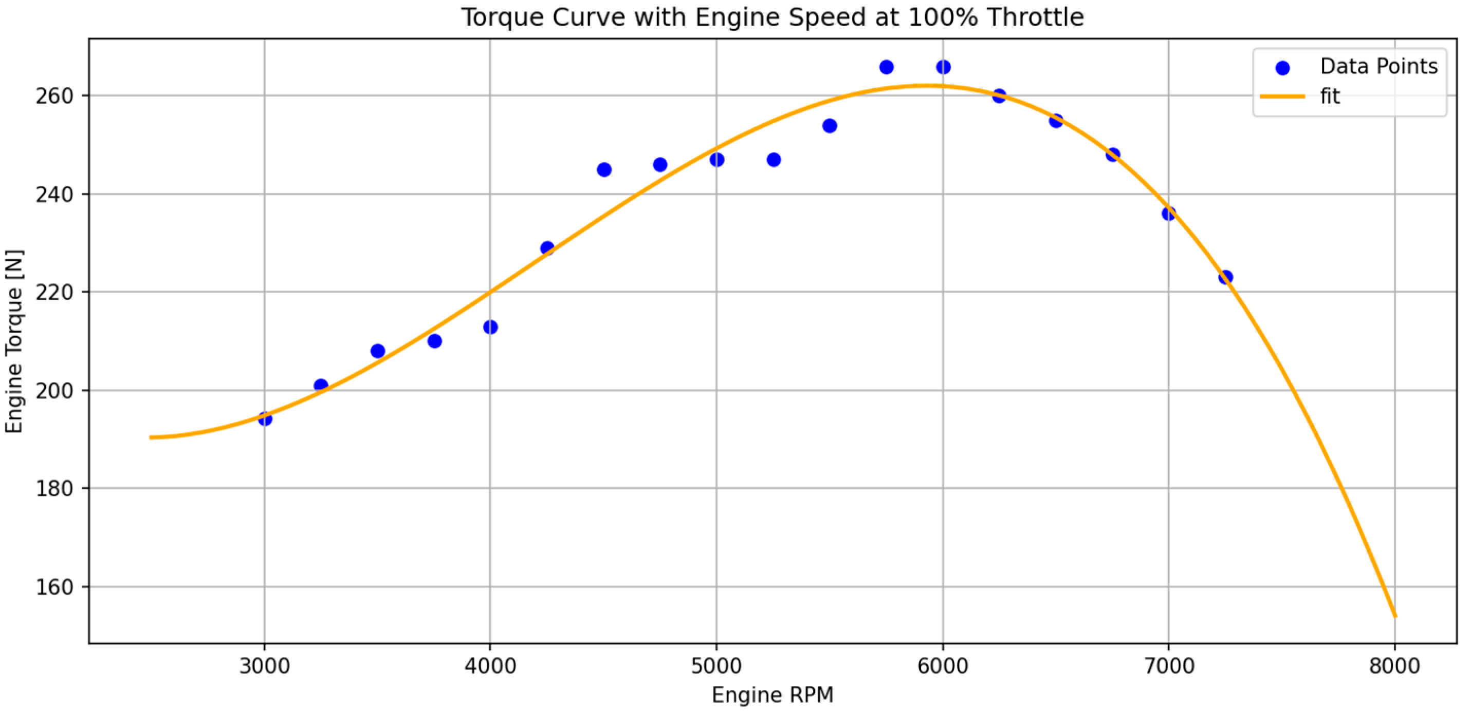 Engine torque data with engine speed and fitted curve.