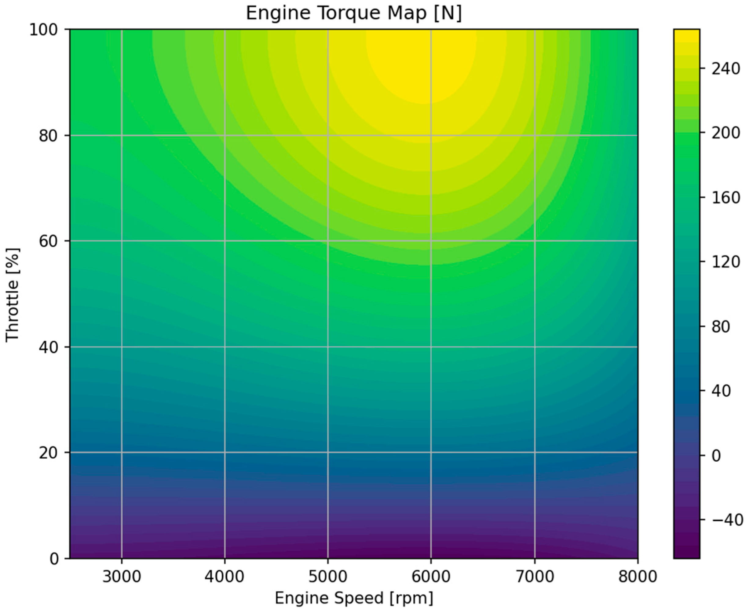 A third-order polynomial representation was selected as a compromise between fitting accuracy and numerical robustness. Lower-order fits were unable to capture the nonlinear saturation behaviour of torque at high throttle and engine speeds, while higher-order polynomials introduced oscillatory behaviour and increased numerical stiffness in the optimisation problem. Since gradient-based nonlinear programming solvers require smooth and well-conditioned derivatives, the third-order fit provided sufficient accuracy while preserving stability and convergence of the optimal control solution. Similar polynomial approximations are commonly adopted in lap time optimisation studies where differentiability of the drivetrain model is required.