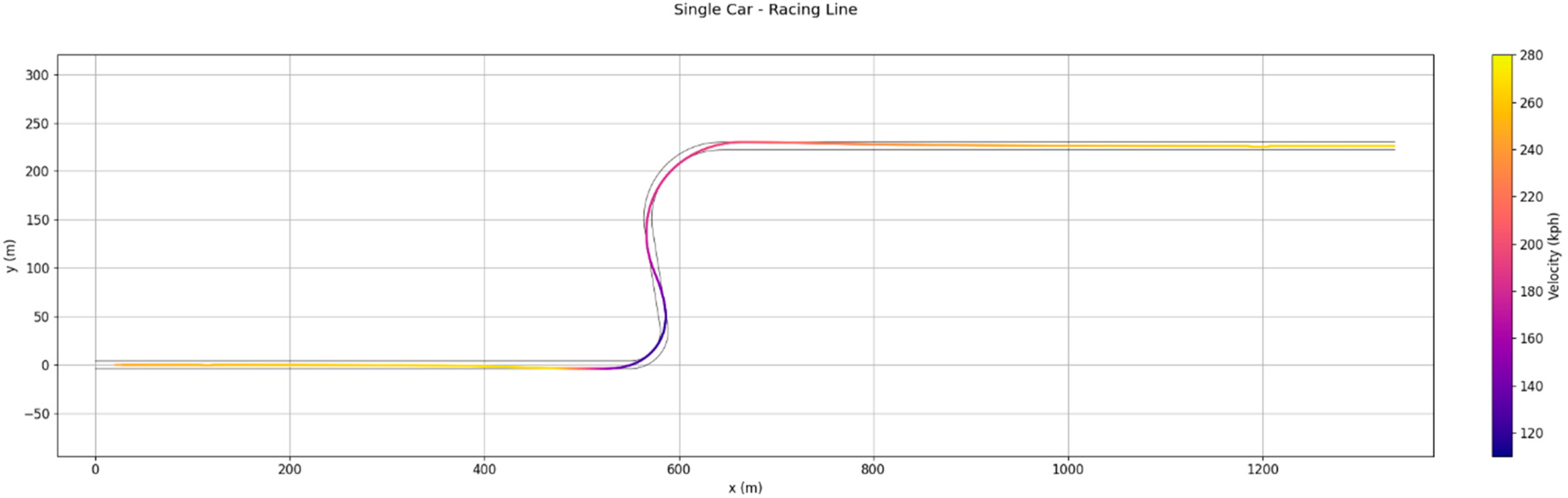 Figure 10 shows the resulting racing line obtained for the single-car simulation, with velocity distribution mapped along the trajectory.