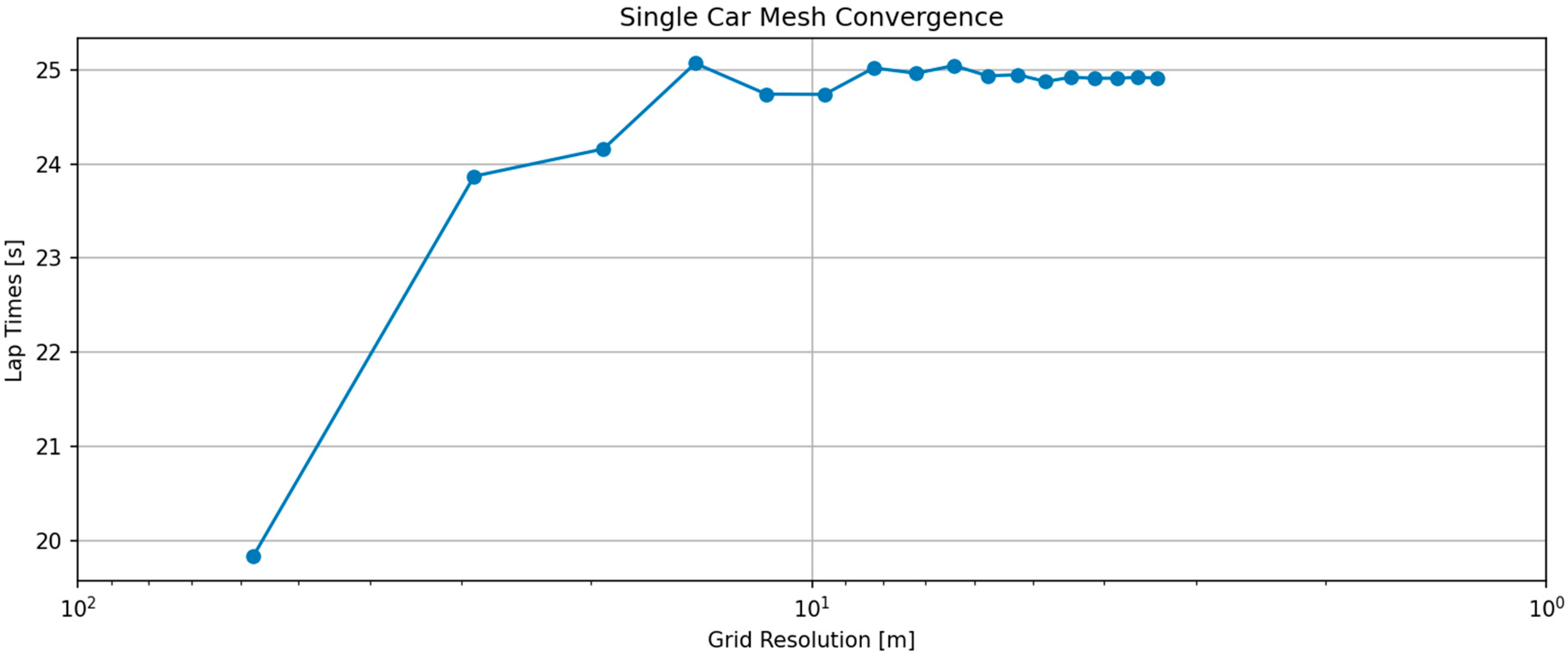 A mesh independence study was conducted for the single-car case. Based on this analysis, 150 segments with three nodes per segment (third-order Legendre) were selected, corresponding to the mesh-independent region. This discretisation also provides sufficient resolution to capture the additional complexity introduced by the aerodynamic wake model and collision constraints. The mesh convergence behaviour and the resulting independence of lap time with respect to grid spacing are illustrated in
