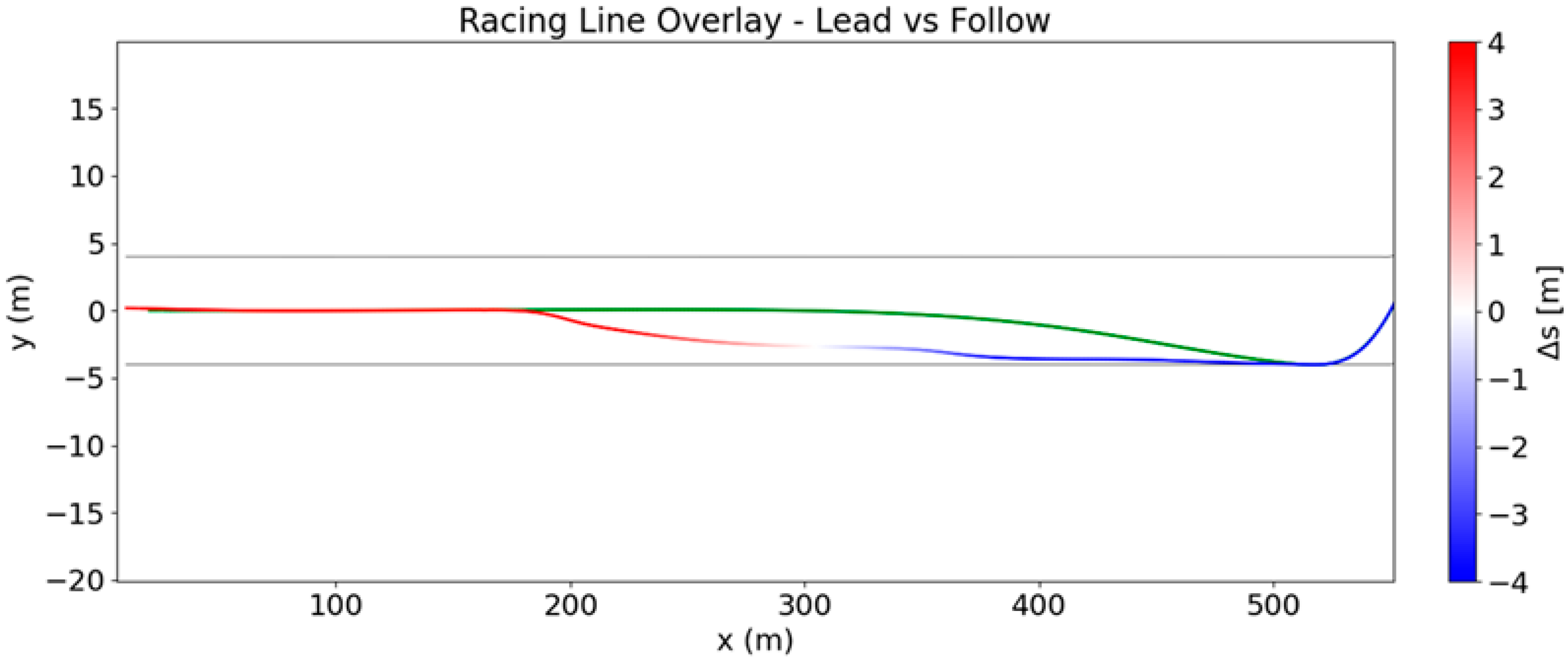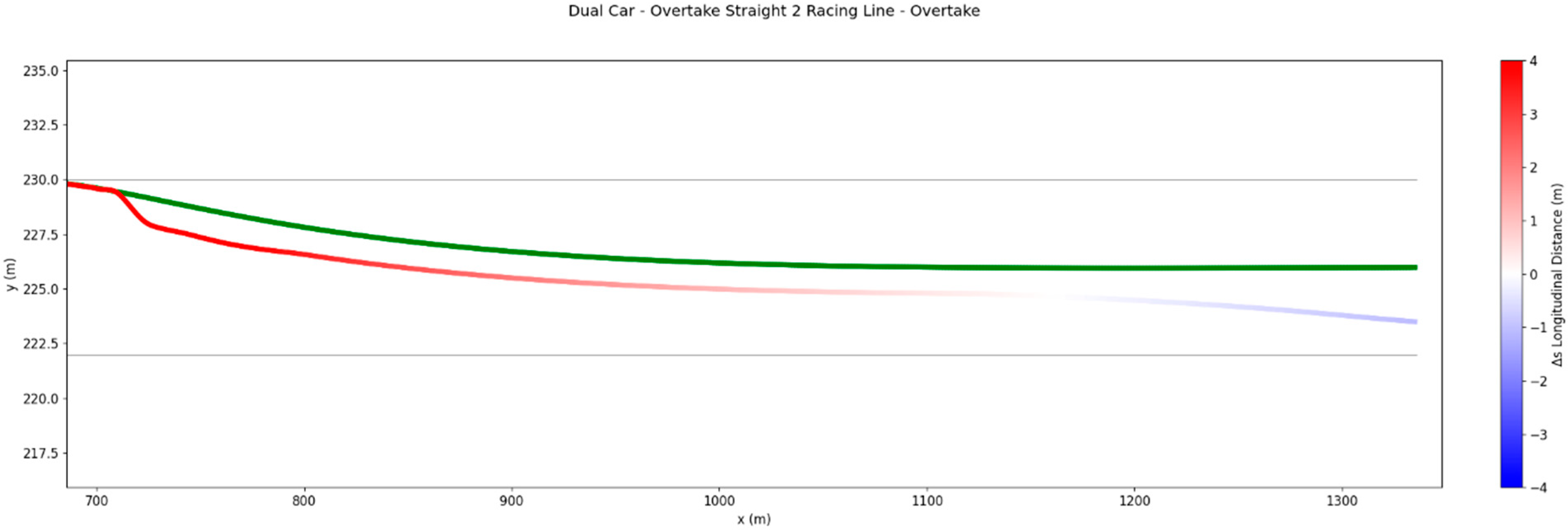 Figure 14 shows a monotonic reduction in gap, confirming that the combined effect of increased exit speed and drag reduction enables continuous closing of the distance to the lead vehicle. The overtake is completed before the next braking zone without violating track boundaries or collision constraints.
