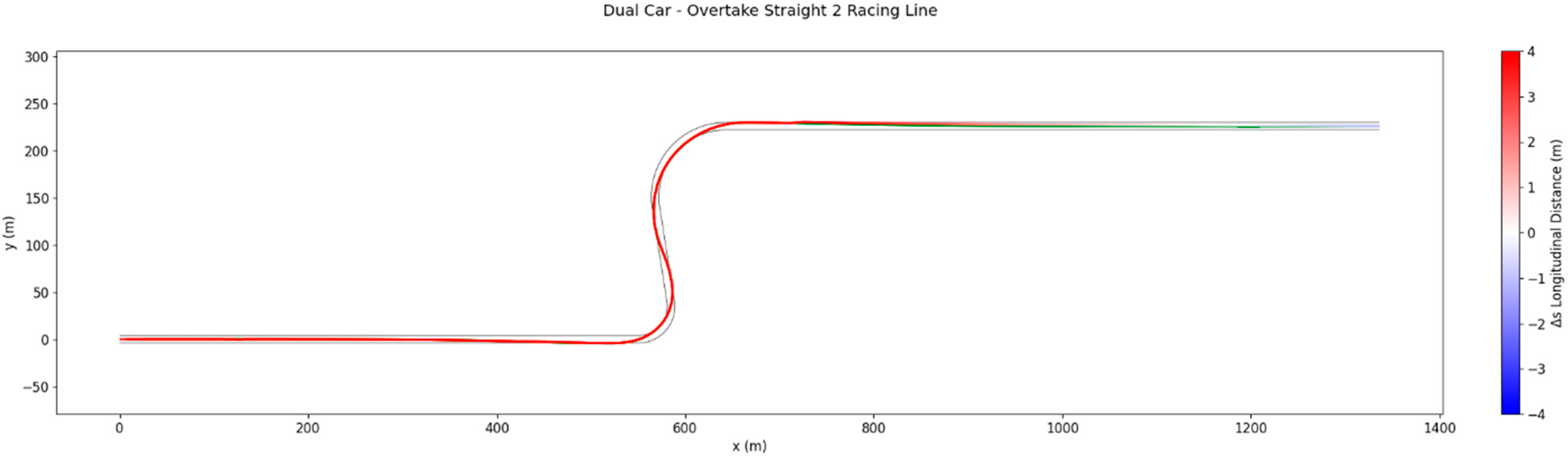 The second overtaking case is configured to occur on the back straight following the medium-speed Turn 2. The active car is assigned a 5% grip advantage and initial conditions of and /s. This setup places the active car close enough to benefit from slipstream on the first straight, but not sufficiently close to complete the overtake immediately, requiring the vehicle to follow the ghost car through the corners before attempting the pass.