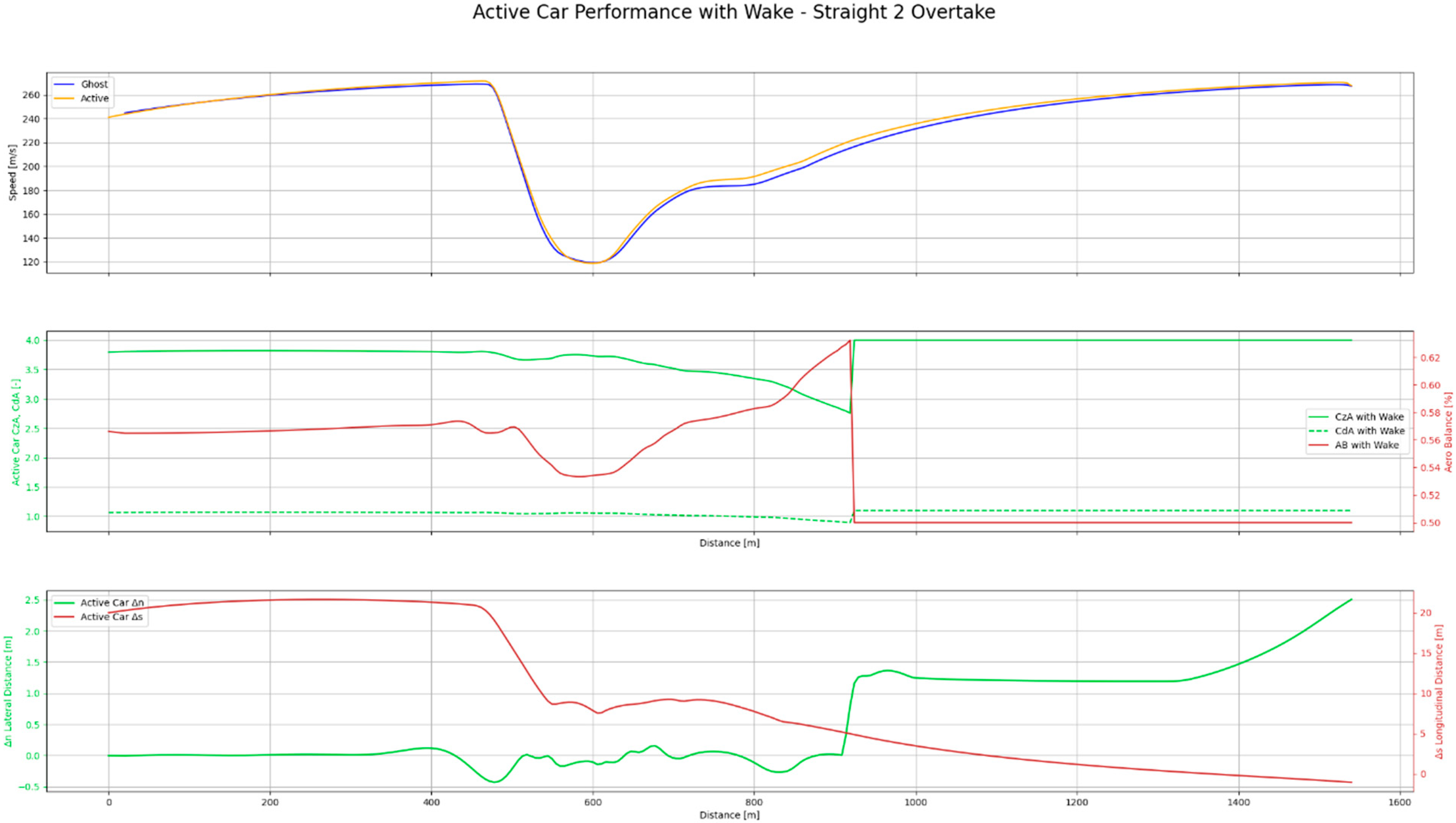 The results show behaviour consistent with real-world racing. On the straight preceding Turn 1, the active car follows closely in the wake of the ghost car, experiencing a reduction in drag but also a significant loss of downforce. As the braking zone is approached, two critical changes occur. First, the active car moves laterally away from the ghost car in order to comply with the collision constraint and initiate the overtaking manoeuvre. Second, this lateral displacement allows the active vehicle to exit the wake at the precise moment when maximum braking performance is required.