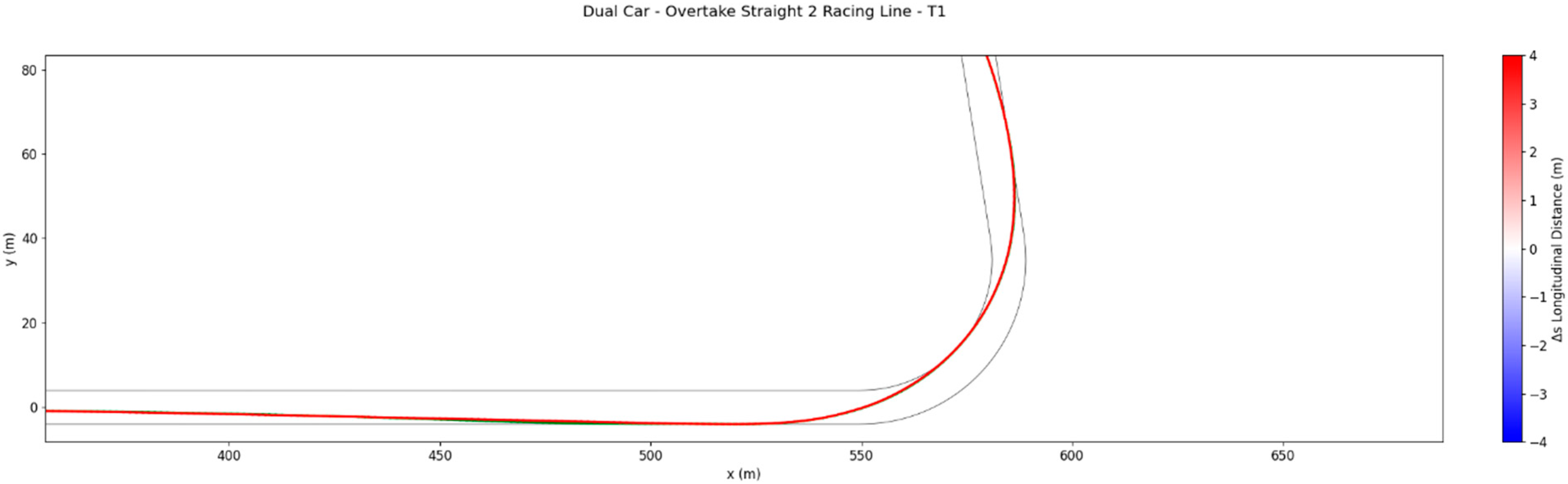 The first overtaking case is configured to occur in the braking zone before Turn 1 (T1). To enable the manoeuvre at this location, the initial conditions of the active car are adjusted. The active car is started 10 m behind the ghost car, matching its initial speed of 68 m/s. Moreover, the active car is given a 5% increase in tyre grip, representing a performance advantage. These conditions replicate realistic overtaking scenarios in Formula 3, where overtakes typically require a grip or pace advantage.