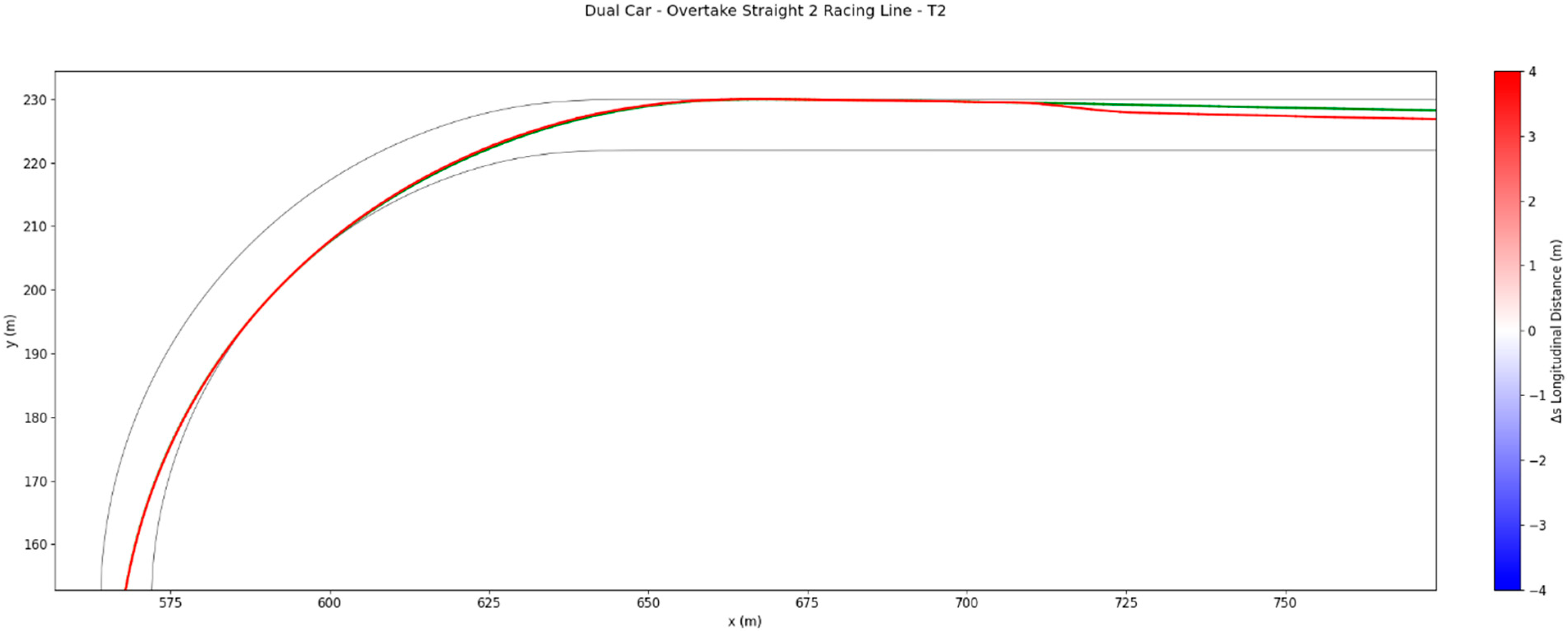 Through Turn 2, the racing line remains broadly similar to that of the ghost car, but another lateral deviation occurs at the exit. The active car shifts outward by approximately 0.26 m away from the ghost’s wake, again improving downforce and restoring a more favourable aerodynamic balance for traction. This manoeuvre sets up the subsequent overtaking attempt on the following straight by maximising exit speed.