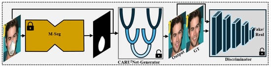 The proposed M2UNet is a segmentation-guided GAN framework designed specifically for face unmasking. It is composed of two sequential stages: (i) a segmentation stage that employs a pre-trained binary segmentation model (M-Seg) to identify occluded facial regions and generate a binary mask map and (ii) an inpainting stage that restores the missing regions using a GAN-based network. The inpainting stage integrates a CARU2-Net-inspired generator (denoted as G) and a lightweight discriminator (denoted as D) with spectral normalization. This design explicitly localizes masked areas and synthesizes realistic, high-fidelity facial reconstructions. The overall architecture is illustrated in Figure 1.