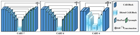 Overview of the Conv-Attention Residual U-block (CARU) variants used in the generator. From left to right, CARU-7, CARU-6, and CARU-4 are shown side by side, illustrating their encoder–decoder depths, skip connections, and multi-scale feature propagation strategies.