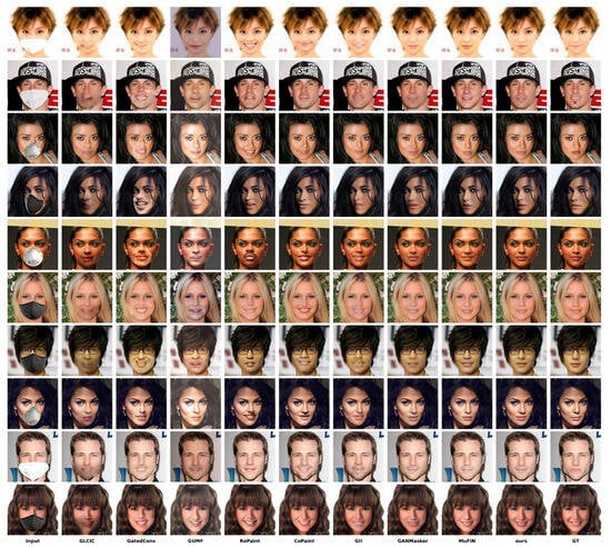- Li, W.; Lin, Z.; Zhou, K.; Qi, L.; Wang, Y.; Jia, J. Mat: Mask-aware transformer for large hole image inpainting. In Proceedings of the IEEE/CVF Conference on Computer Vision and Pattern Recognition, New Orleans, LA, USA, 18–24 June 2022; pp. 10758–10768. [Google Scholar]