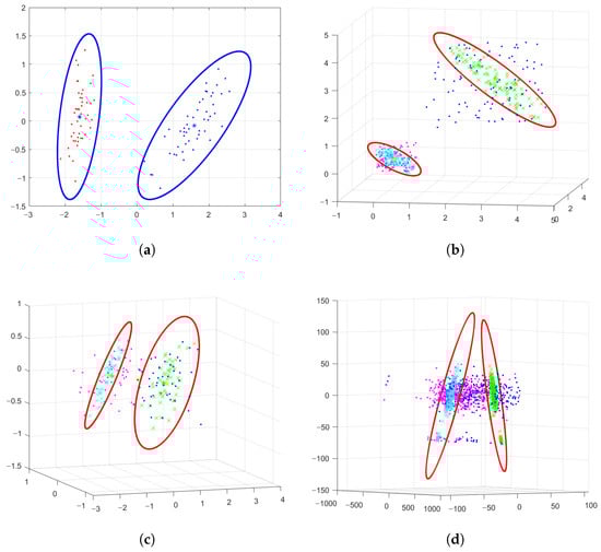 We visualized the EL-GEPSVM in Figure 2 on four datasets: Iris2D, Uniform3D, Iris3D, and Pimadata3D. For the Iris2D dataset, we selected classes 1 and 2 from the full iris dataset, then we projected the raw data samples to a 2D linear space with PCA algorithm. Similarly, for Iris3D, we selected classes 2 and 3 from the full iris dataset, then utilized PCA to reduce the dimensions of the raw data to three. For Uniform 3D, we randomly generated 100 data samples for two different classes. The samples of each class follow the uniform distribution. For Pimadata3D, we reduced the dimensions of raw data samples from the Pima dataset to three. According to Figure 2a–c, we can clearly see that the ellipsoidal convex hull supported by two hyperplanes can cover the sample of each category. Samples of two categories are projected to the hyperplane (in green and cyan colors). After the construction of two hyperplanes with the EL-GEPSVM, two ellipsoidal convex hulls are solved as well (two ellipses), which describe the location relationship between the convex hull and the projection points directly. The ellipsoidal convex hull is able to separate data from two categories for better classification. This shows that the ellipsoid-structured LGEPSVM can feasibly act as a classifier. From Figure 2d, the EL-GEPSVM makes a clear separation with convex hulls to distinguish samples from two different classes in 3D space. Each pair of projection points and the ellipse lie on the same plane, proving the correctness of Theorem 3 and Algorithm 1.