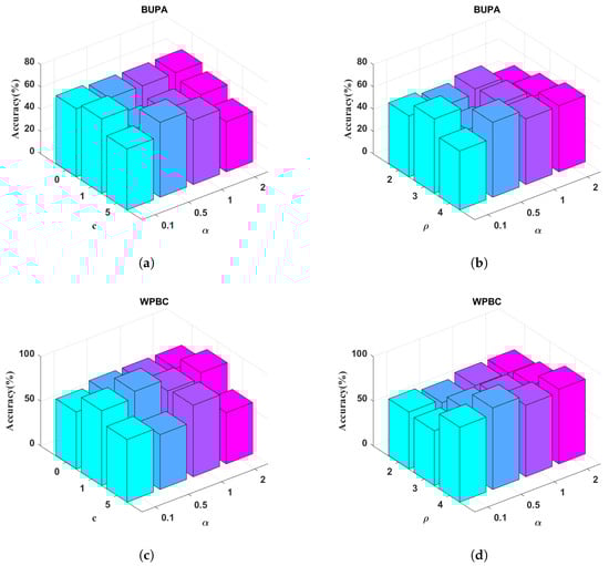 From Figure 4, we can observe the following: (1) The best performance of the proposed method is located in and . (2) The setting of is critical to the performance of classification. For example, in the Pima dataset (see Figure 4a), the proposed method shows better performance when setting a lower value. In contrast, the changing is stable when . (3) The accuracy varies when . In Checkdata (see Figure 4b), the highest accuracy is achieved when . In Sonar data, the highest accuracy is on . We also tuned the parameters of the polynomial kernel: scaling factor , bias c, and degree . The parameter analysis results on the BUPA and WPBC datasets are shown in Figure 5. The parameter analysis on the BUPA and WPBC datasets demonstrates that the performance of the EL-GEPSVM is sensitive to the choice of kernel parameters. However, stable high accuracies can be obtained within certain ranges. For BUPA, the best results are achieved when or , combined with moderate values [0.5, 1]. For WPBC, the method consistently performs well when or with an accuracy peak above 90% at . These results confirm that appropriate parameter selection can significantly enhance the performance.