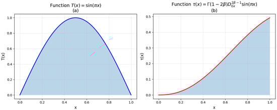 Figure 2b shows the graph of the function , which is the result of applying the fractional Riemann–Liouville integral operator of order (where ) to , as defined by Formula (12). The function represents the value of the sought solution on the gluing interval of the axis () and plays a key role in the functional relationships between the elliptic and hyperbolic parts.