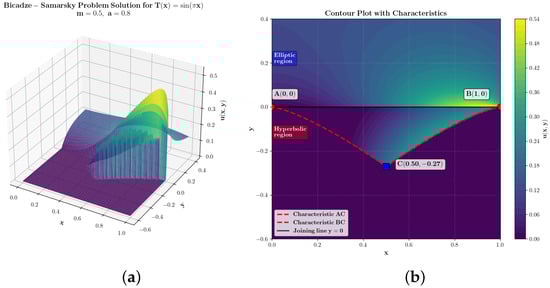 Figure 3 shows the wave pattern, which consists of a 3D surface (Figure 3a) and a contour plot (Figure 3b). They reflect the solution of the Bitsadze–Samarskii-type problem. It can be seen that the solution is continuous and the gluing condition is fully satisfied—the contour lines (Figure 3b) from the hyperbolic part smoothly transition into the contour lines of the elliptic part. The mathematical component of the problem is correctly fulfilled.