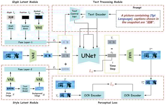 We also use a text perceptual loss used in Anytext to further improve the accuracy of text generation. We employ the VAE decoder to reconstruct , yielding . Subsequently, we utilize character position information to crop T and , resulting in and . These cropped images are then encoded using the encoder of the PP-OCRv3 (https://github.com/yinjiuzui/PaddleOCR (accessed on 12 January 2025)). model, producing their respective representations m and . The corresponding loss function is defined as