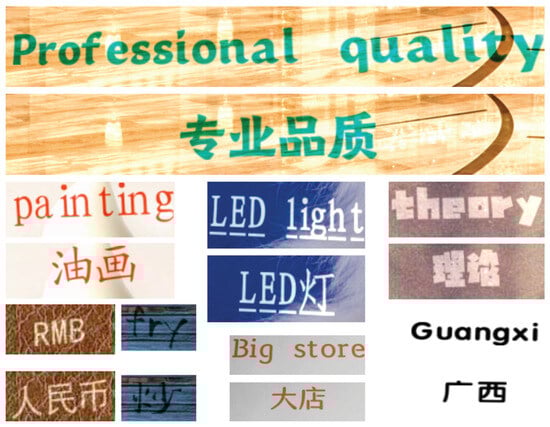 - Nayef, N.; Patel, Y.; Busta, M.; Chowdhury, P.N.; Karatzas, D.; Khlif, W.; Matas, J.; Pal, U.; Burie, J.C.; Liu, C.L. ICDAR2019 Robust Reading Challenge on Multi-lingual Scene Text Detection and Recognition—RRC-MLT-2019. In Proceedings of the 2019 International Conference on Document Analysis and Recognition (ICDAR), Sydney, Australia, 20–25 September 2019. [Google Scholar]