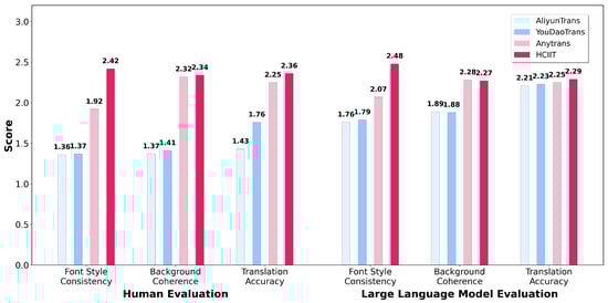 We selected five graduate students with strong proficiency in both English and Chinese to conduct the annotations. As depicted in Figure 6, diffusion-based methods exhibit good background coherence, yet they still encounter some instances of generation failures. However, commercial systems demonstrate weak background coherence but maintain a level of stability. Manual and large language model evaluations consistently demonstrate favorable results for our method, showcasing higher translation accuracy and better style consistency. In addition, we find that the LLM scores are generally higher than those given by human annotators, indicating that the alignment of the values of the LLM-based evaluators remains an important direction for future exploration.
