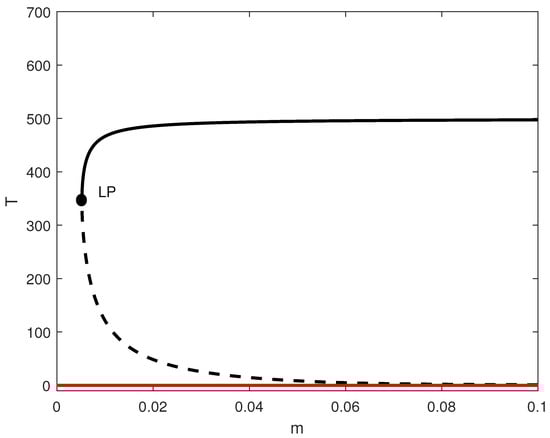Figure 1 demonstrates the bifurcation diagram for the dimensionless system with baseline parameters. The bifurcation diagrams presented assume the generic non-degeneracy conditions detailed in Appendix B (Assumptions A2–A4), which hold for the parameter values studied. Under the generic conditions of Appendix B, the model anticipates two limit points (LP) at and , enclosing three distinct regimes: