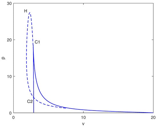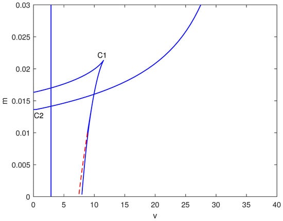 where and is given by (A9). Since v enters linearly in H, one may solve explicitly for v as a parametric equilibrium branch in the -plane: