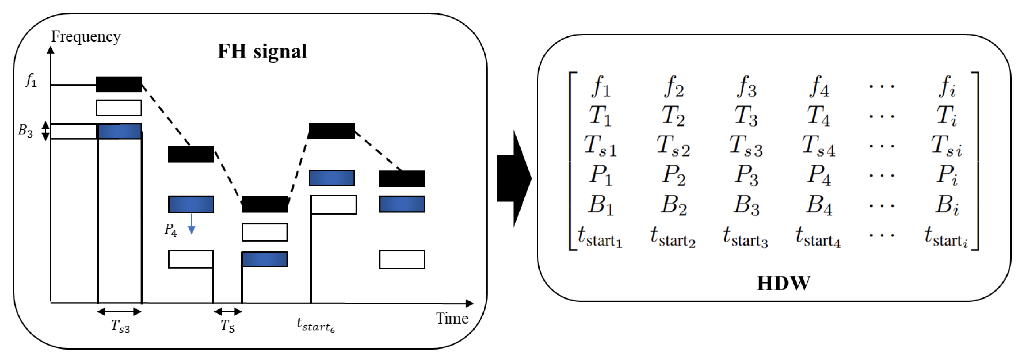 - Gu, C.H.; Wang, L.W. A method for orthogonal FH signals dynamic sorting. J. Astronaut. 2012, 33, 1699–1705. [Google Scholar] [CrossRef]