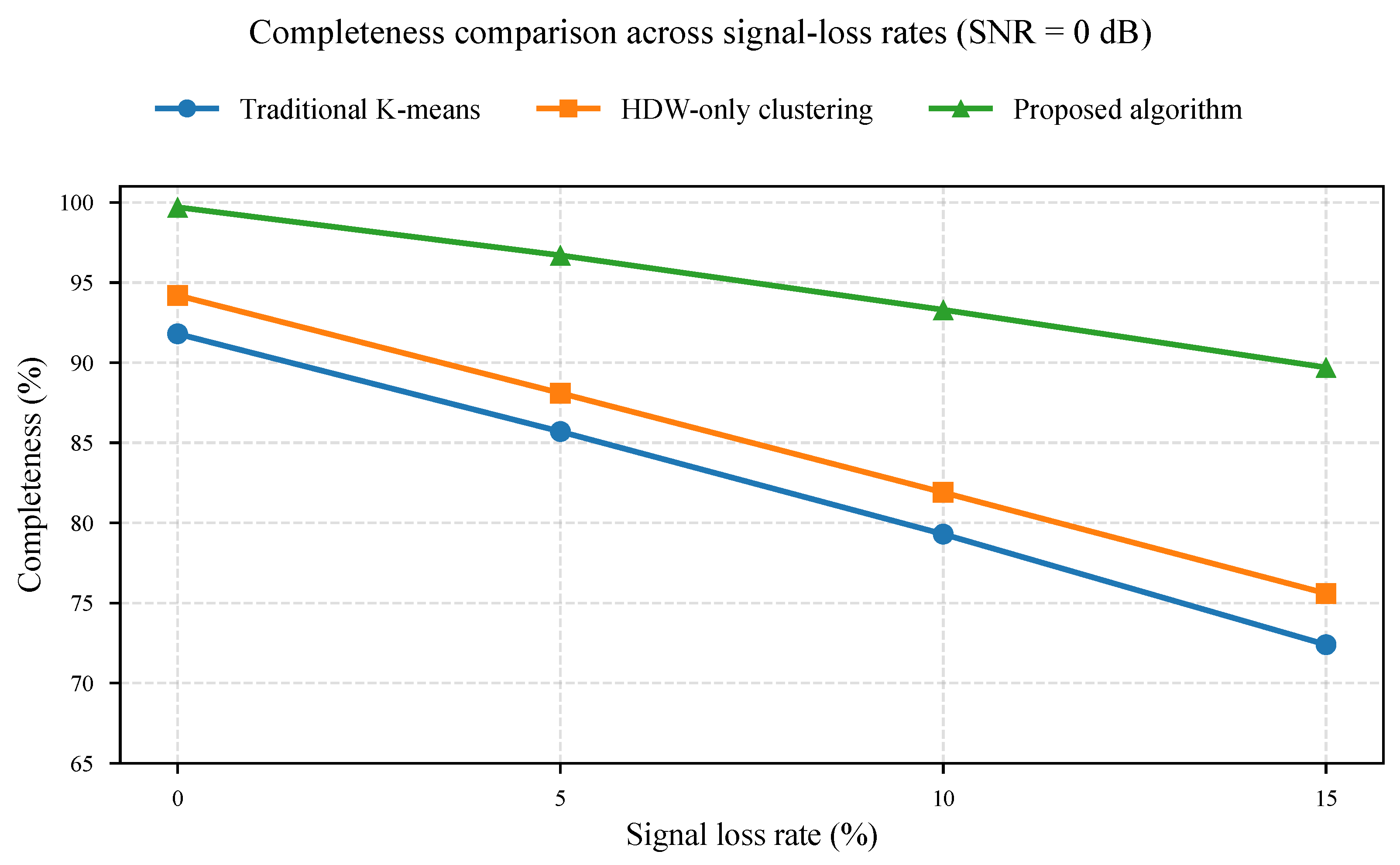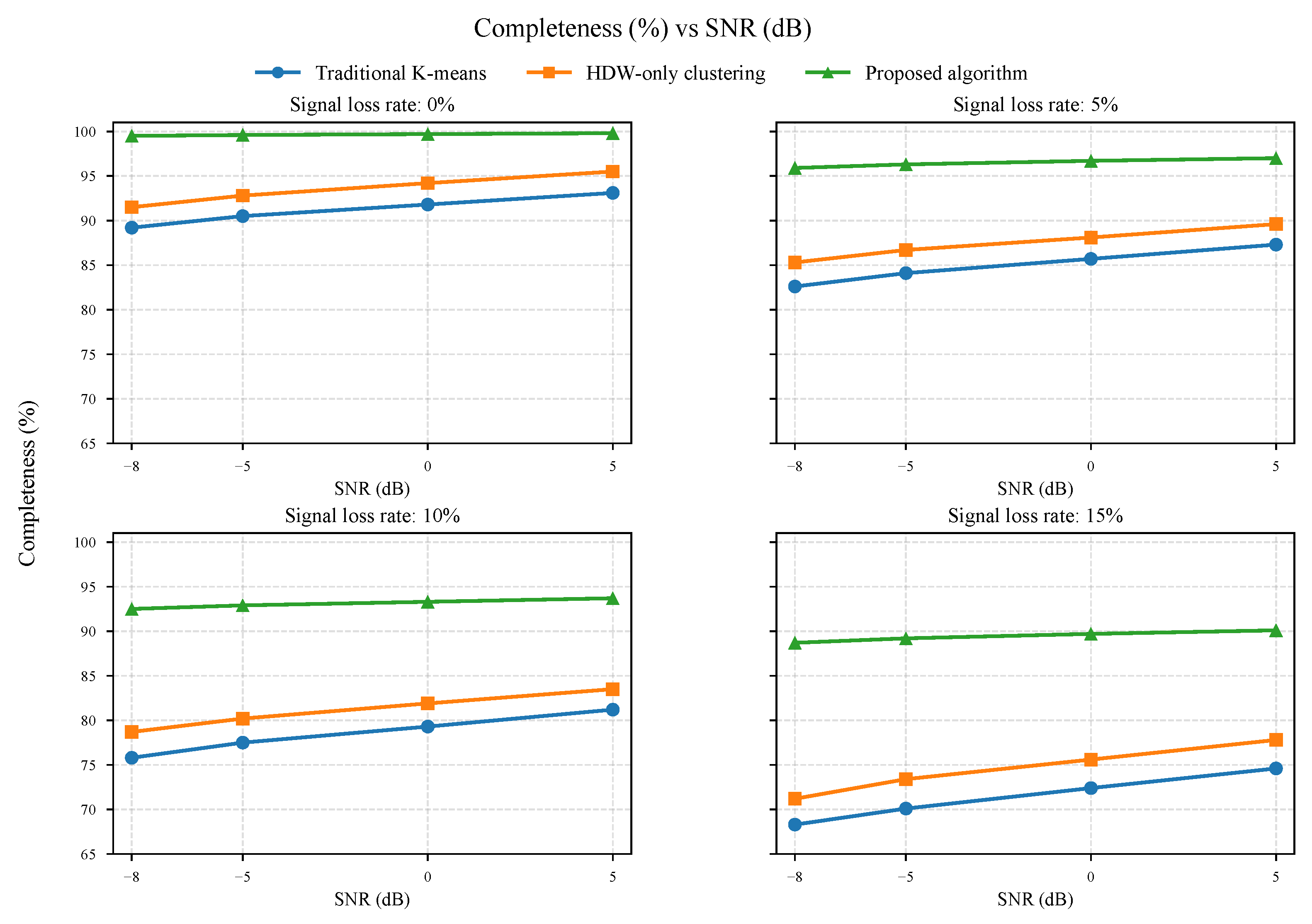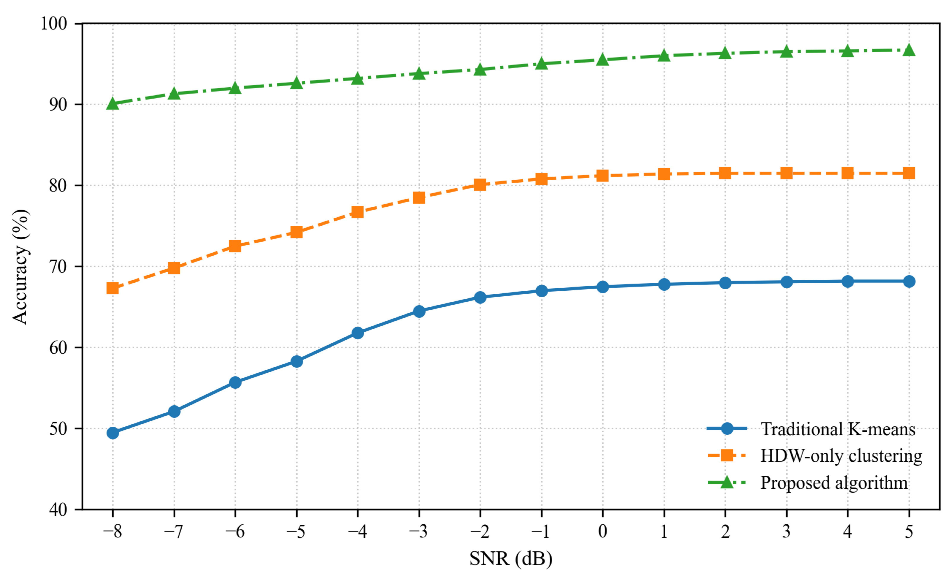 - Experimental Scenario Design: A “multi-network mixed interference” scenario is constructed to simulate the actual electromagnetic environment, with parameters as follows: The total number of networks is 10 frequency-hopping networks, including 4 networks with inconsistent characteristics and 6 asynchronous networks with similar characteristics. The frequency-hopping parameter range covers a frequency of 100–200 MHz, a period of 100–300 μs, and a dwell time of 50–150 μs. The signal-to-noise ratio (SNR) settings are −8 dB, −5 dB, 0 dB, and 5 dB, covering scenarios from low SNR to normal SNR. The signal loss rates are 0%, 5%, 10%, and 15%, simulating signal loss caused by channel fading. The comparison algorithms include the traditional K-means algorithm and the HDW-only clustering algorithm.