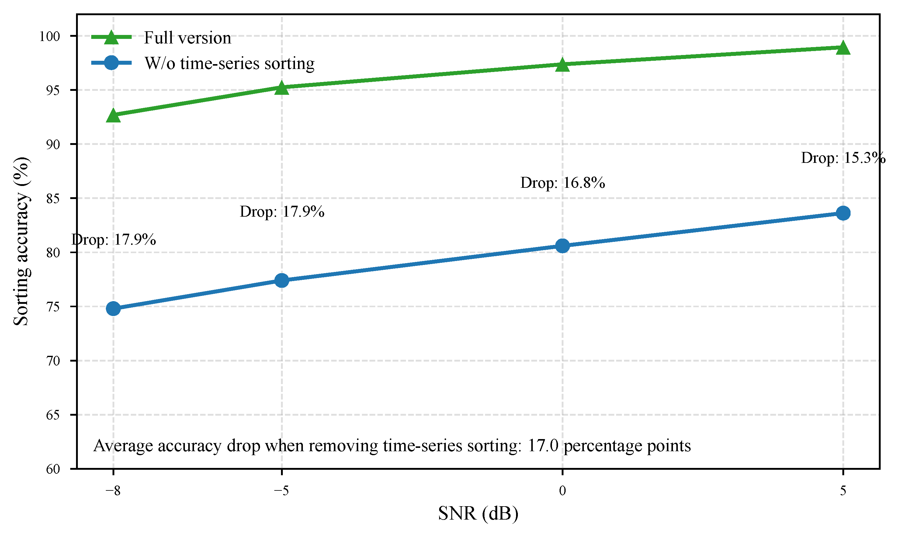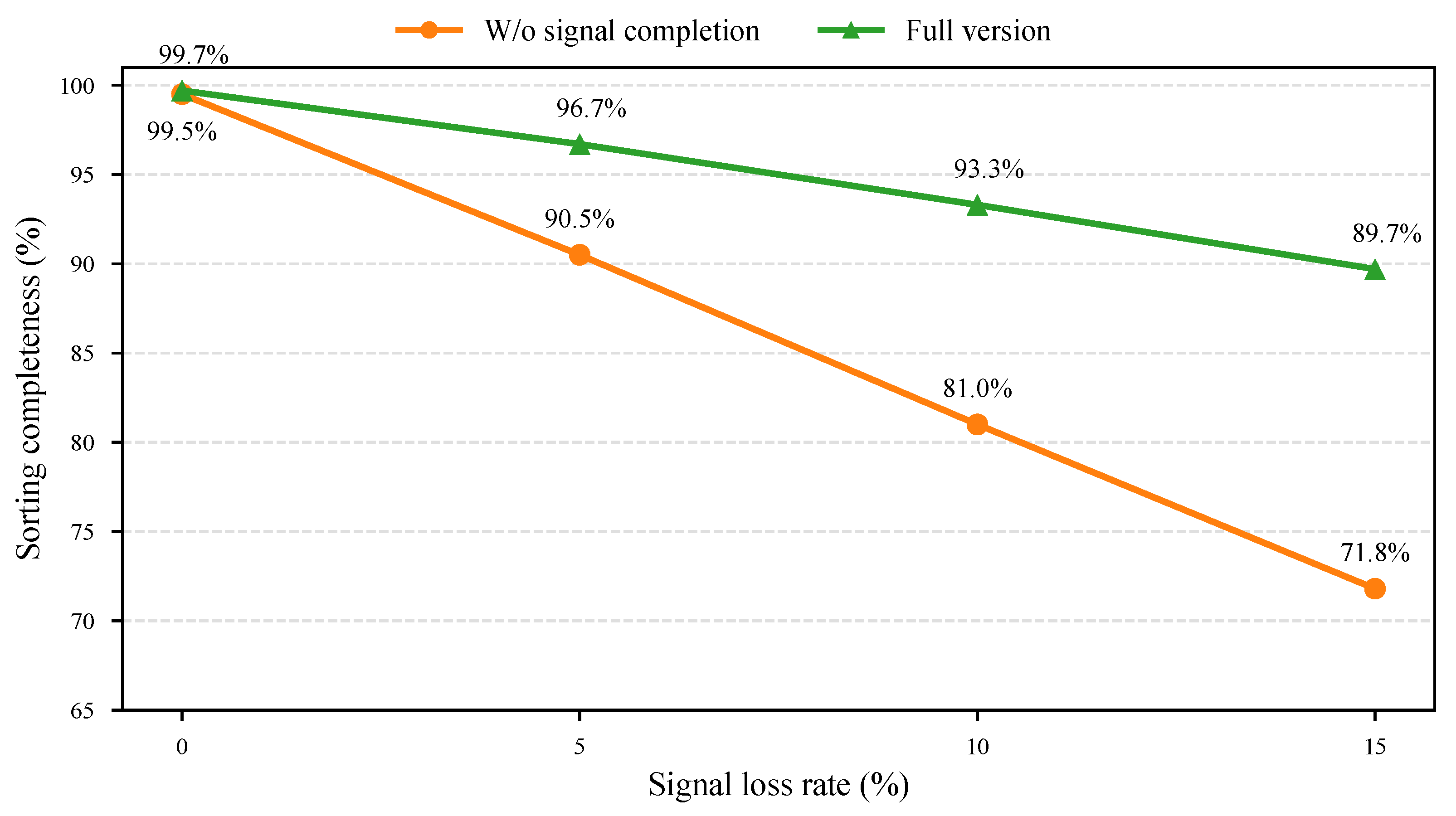 - Experimental Objective: Verify the differences in performance of the “HDW + clustering-temporal sorting” algorithm under different AHP feature weighting strategies, and confirm that the proposed weighting scheme (prioritizing core static features) can effectively improve the discrimination of initial clustering and lay a reliable foundation for subsequent temporal sorting and signal completion.