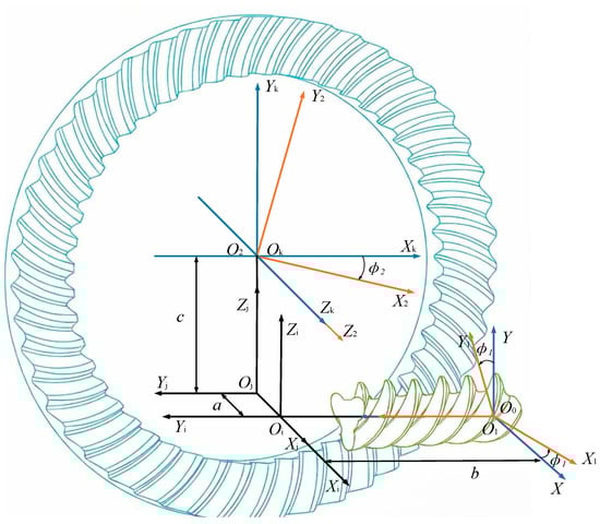 In the aforementioned Equation (1), represents the coordinate transformation matrix from coordinate system to . Specifically, and denote the transformations between the gear/worm-fixed systems and their respective initial positions; and are auxiliary transformations representing the spatial orientation; and describes the relative position between the worm and gear axes.