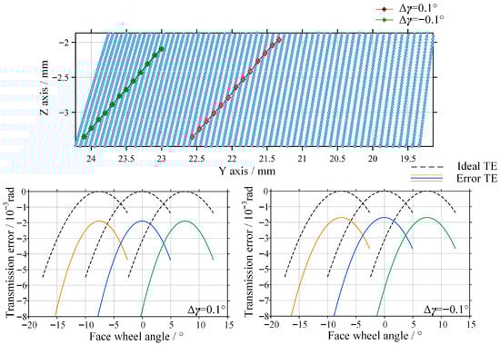 The contact pattern mainly drifts along the face width direction. A positive axial error causes the contact region to shift toward the outer radius of the face gear, while a negative axial error drives the contact region toward the inner radius. However, compared with the offset error, the magnitude of the contact trace drift is relatively small. The amplitude of the transmission error curve increases in a gradual manner. These results indicate that the curved face gear inherits the advantage of conventional face gears, namely low sensitivity to axial misalignment. Therefore, in practical engineering assembly, the axial positioning tolerance can be appropriately relaxed to reduce assembly difficulty.