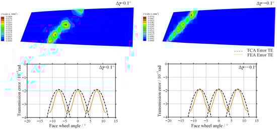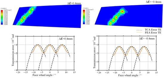 As shown in Figure 14, after introducing offset error, the contact pattern exhibits a drift along the face width direction, which is consistent with the results obtained from TCA. When a positive offset error is introduced, the transmission error amplitude obtained from numerical TCA is 0.85 × 10−3 rad, while the amplitude obtained from finite element analysis is 0.98 × 10−3 rad, representing an increase of 15.3%. When a negative offset error is introduced, the transmission error amplitude predicted by TCA is 0.87 × 10−3 rad, whereas the corresponding finite element result reaches 1.02 × 10−3 rad, with an increase of 17.2%. These results are consistent with the conclusion drawn from the TCA that the system exhibits higher sensitivity to negative offset error.