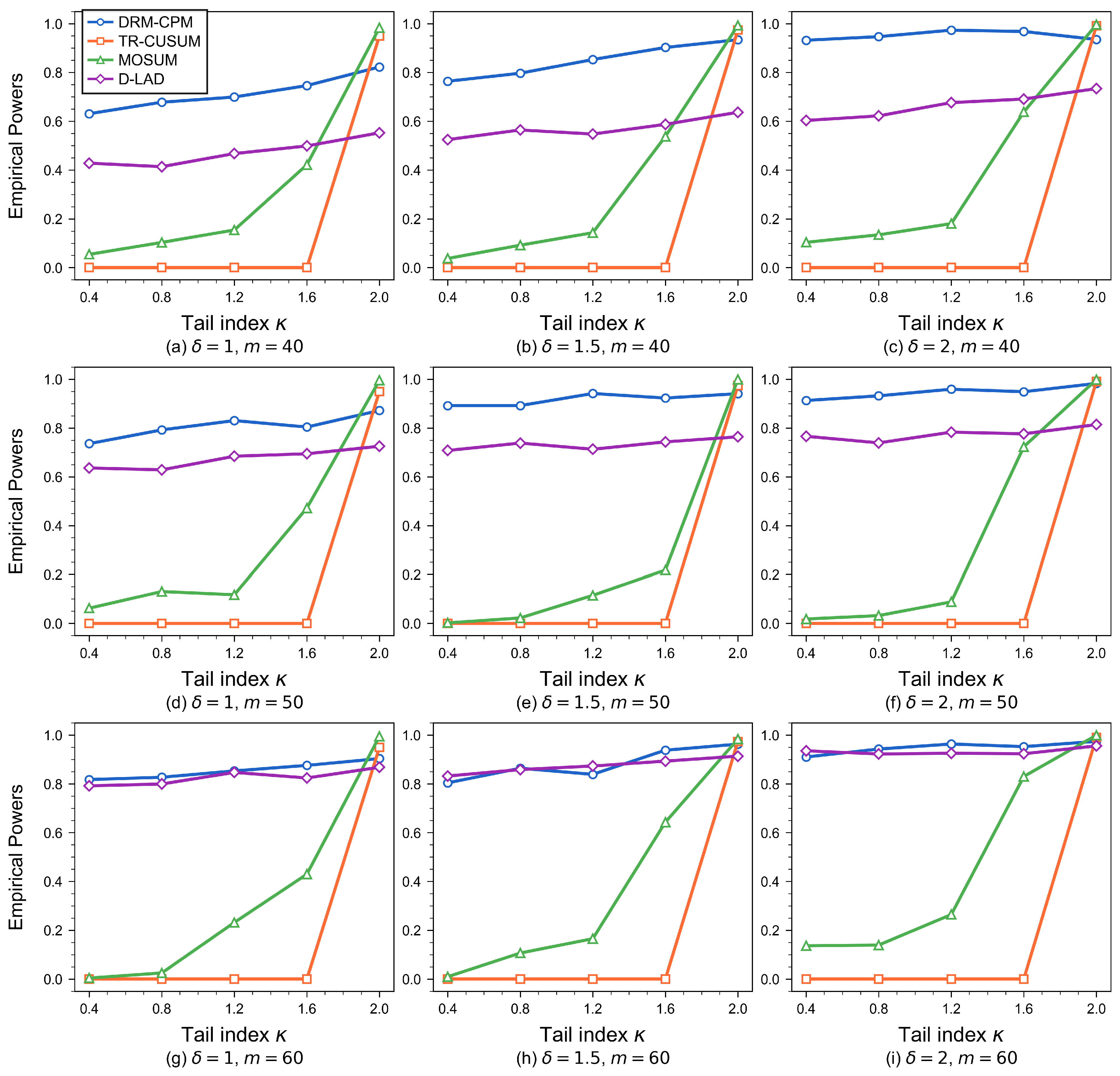 | DRM-CPM | TR-CUSUM | MOSUM | DRM-textbf | TR-CUSUM | MOSUM | |