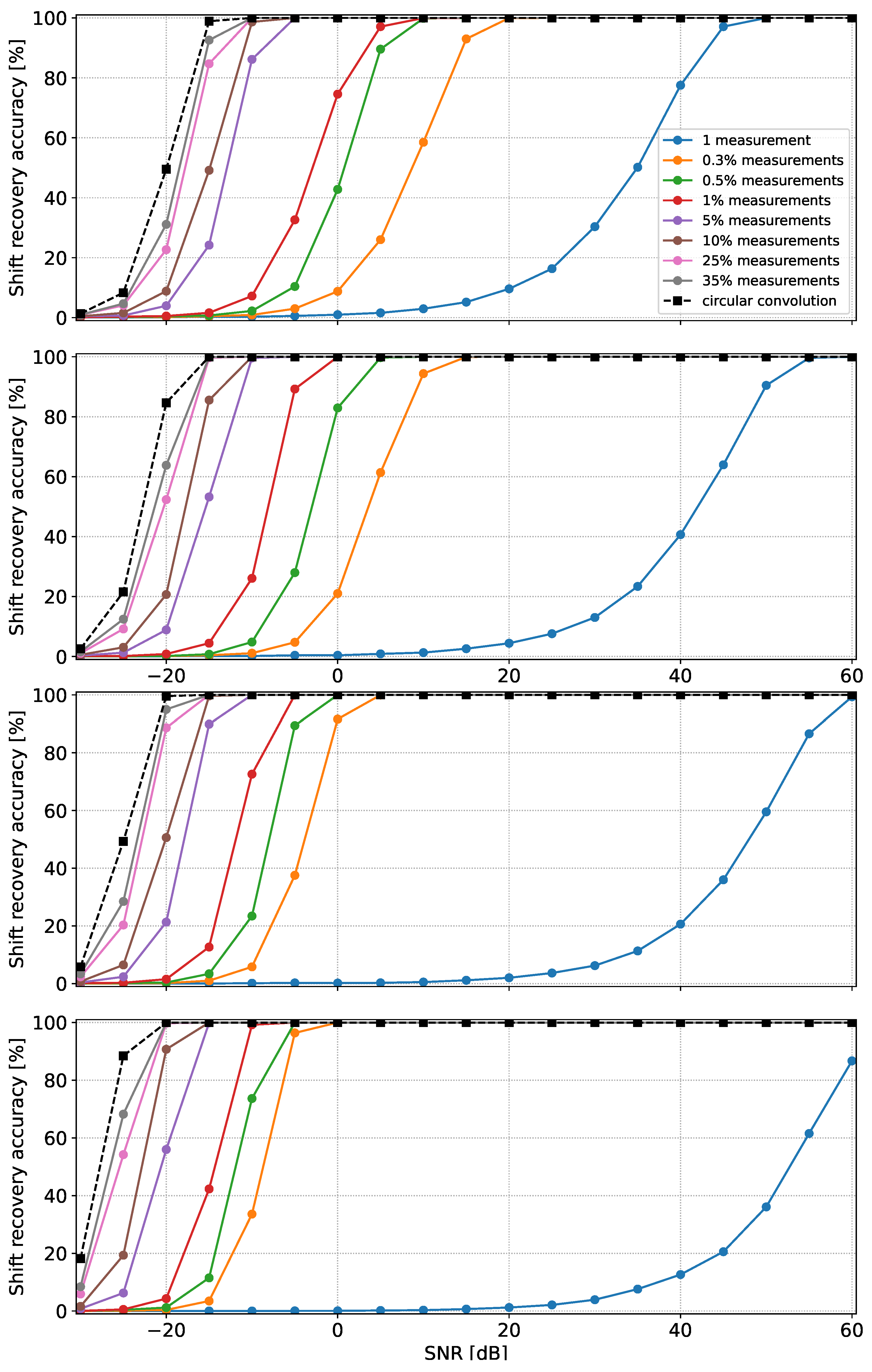 The results developed in this section assume no noise is present in the measurements. As already explained in Remark 2, we expect noisy measurements to significantly degrade the performance of the shift retrieval and make impractical the recovery mechanism from a single measurement.